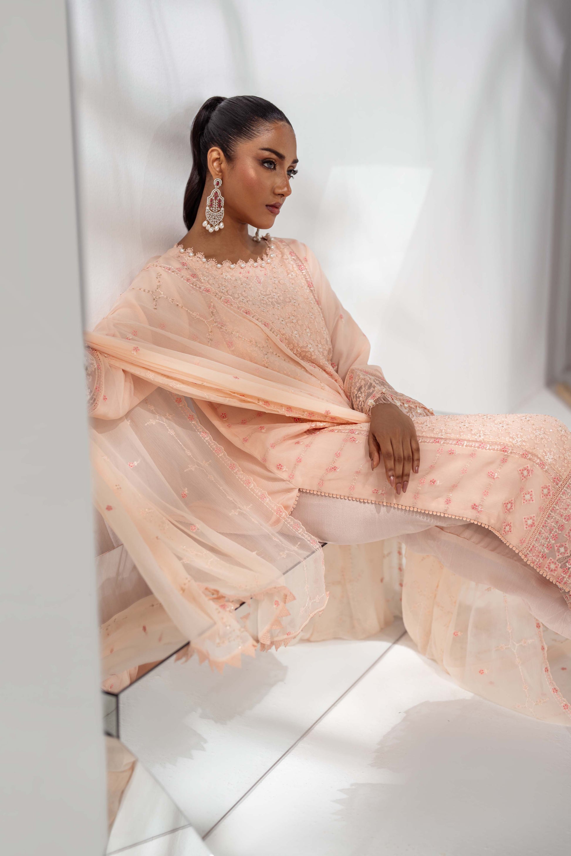 Redefine grace with Mehru, a stunning chiffon ensemble designed to captivate: