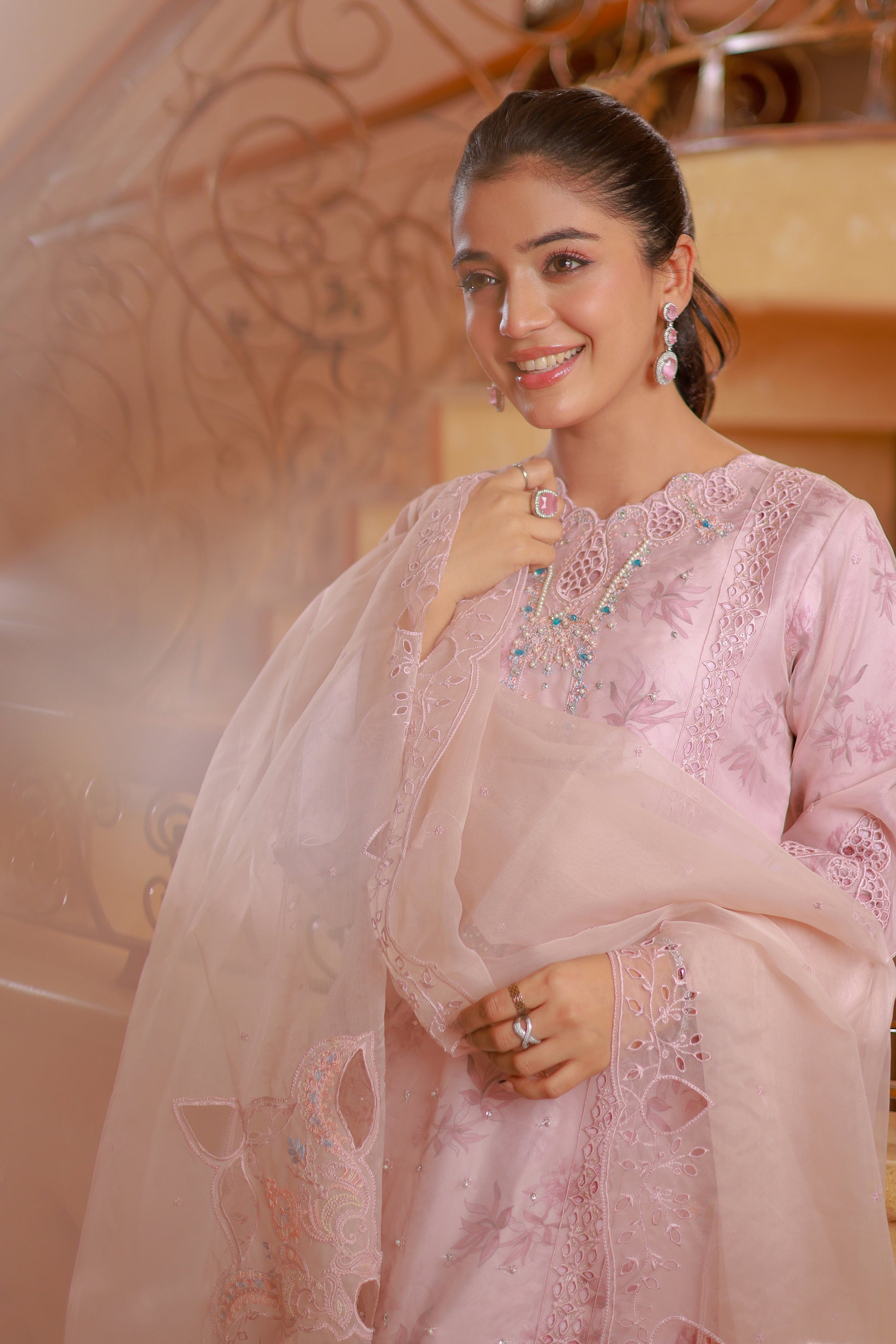 Shirt: A masterpiece of elegance, featuring Organza fabric intricately embroidered with delicate handwork, Daman CutWork, enchanting Lacework, and adorned with a captivating floral Print Silk Inner.