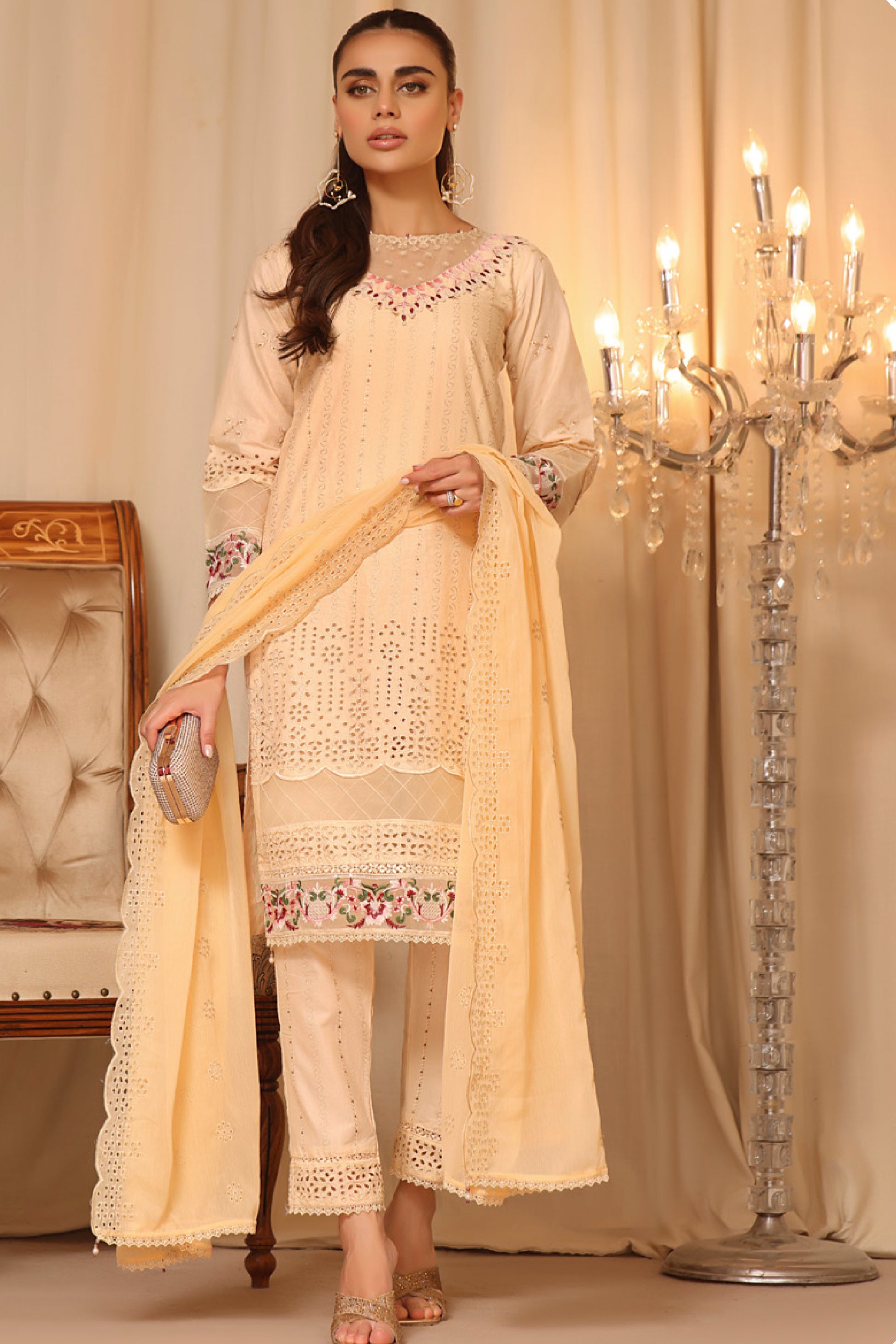 Trouser: Designed in lawn with full Chickenkari lacework, ensuring a perfect blend of tradition and modernity.