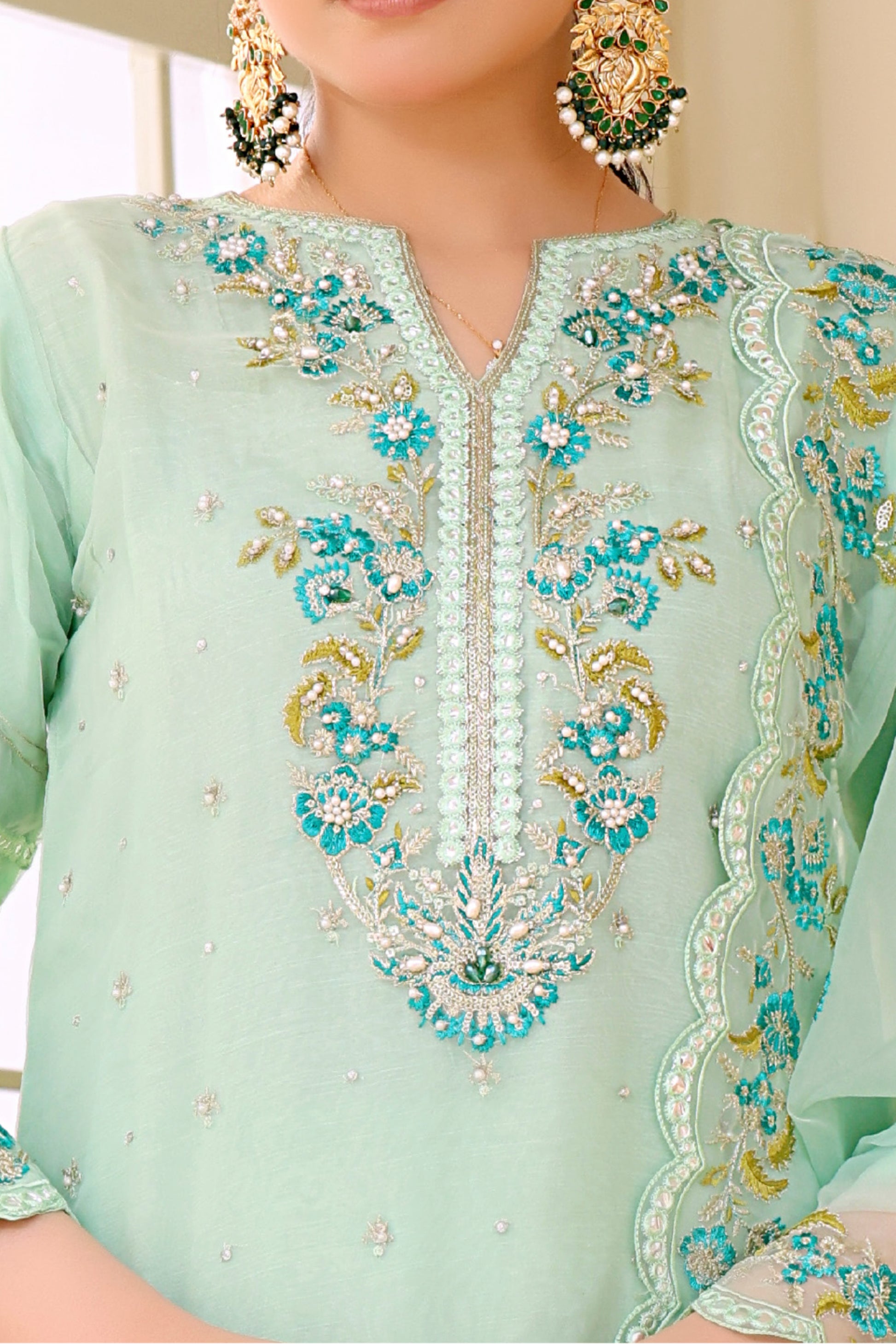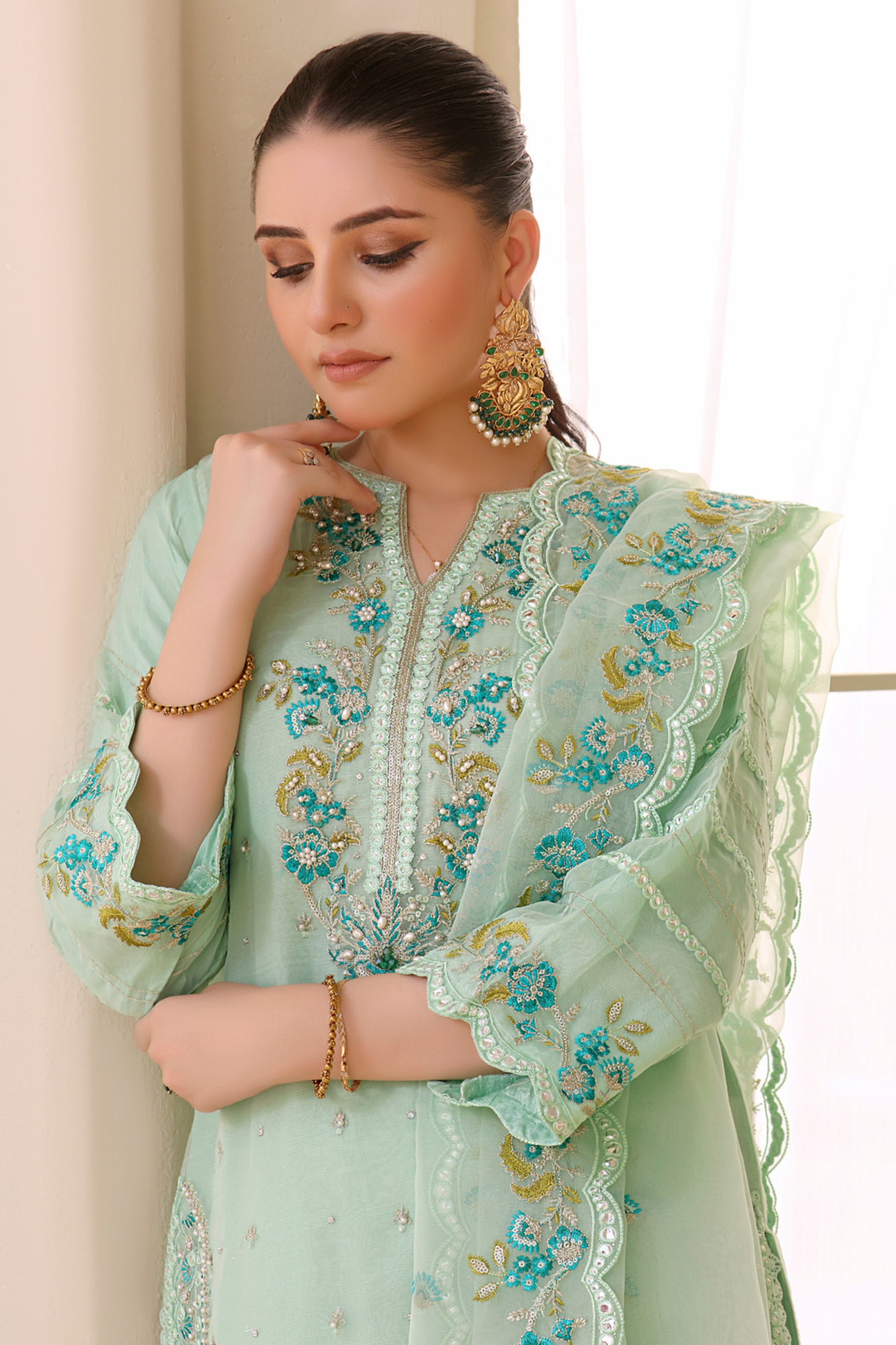 Dupatta: Embellished Organza dupatta with mesmerizing foil work and lacework, elevating the ensemble to new heights of elegance.