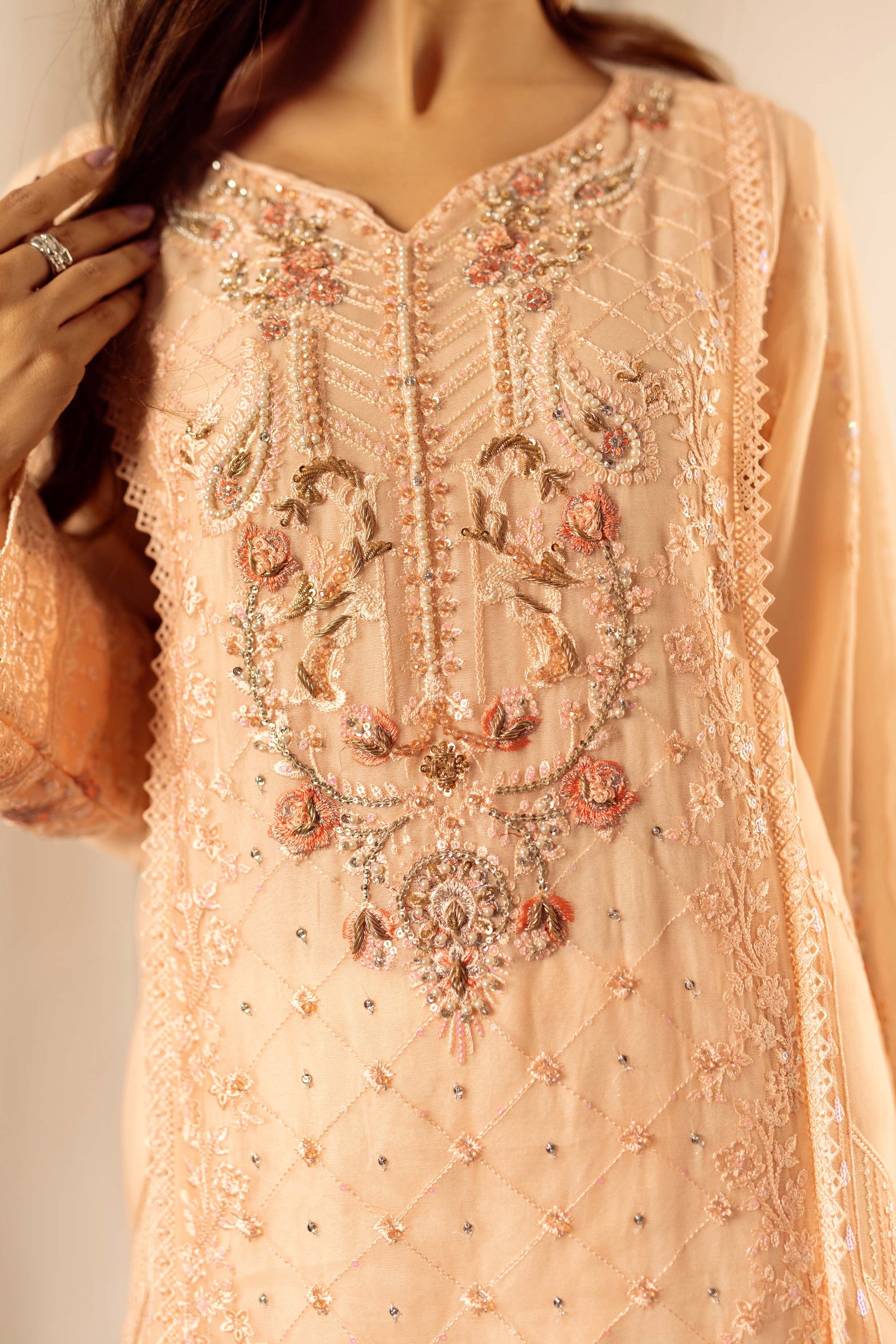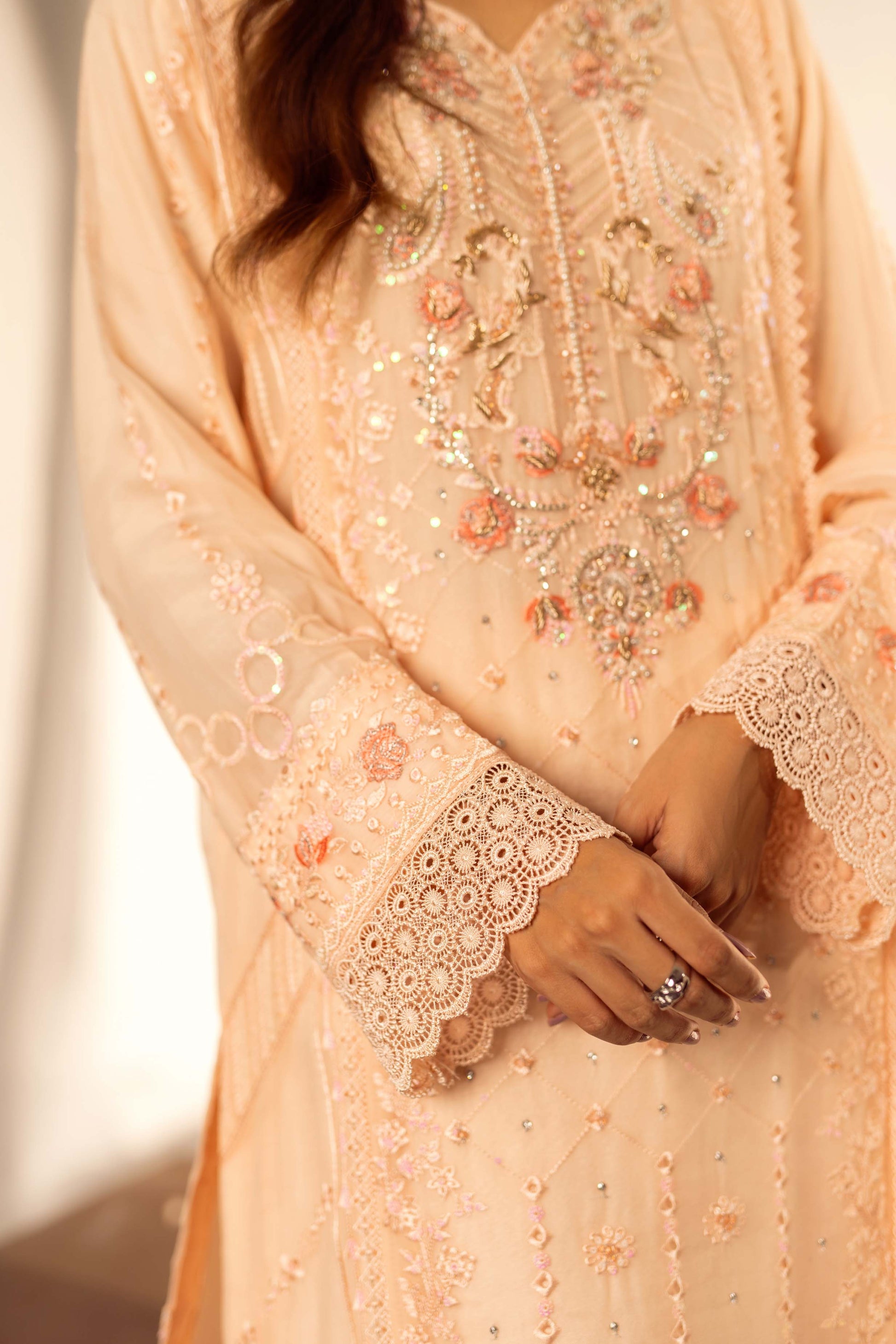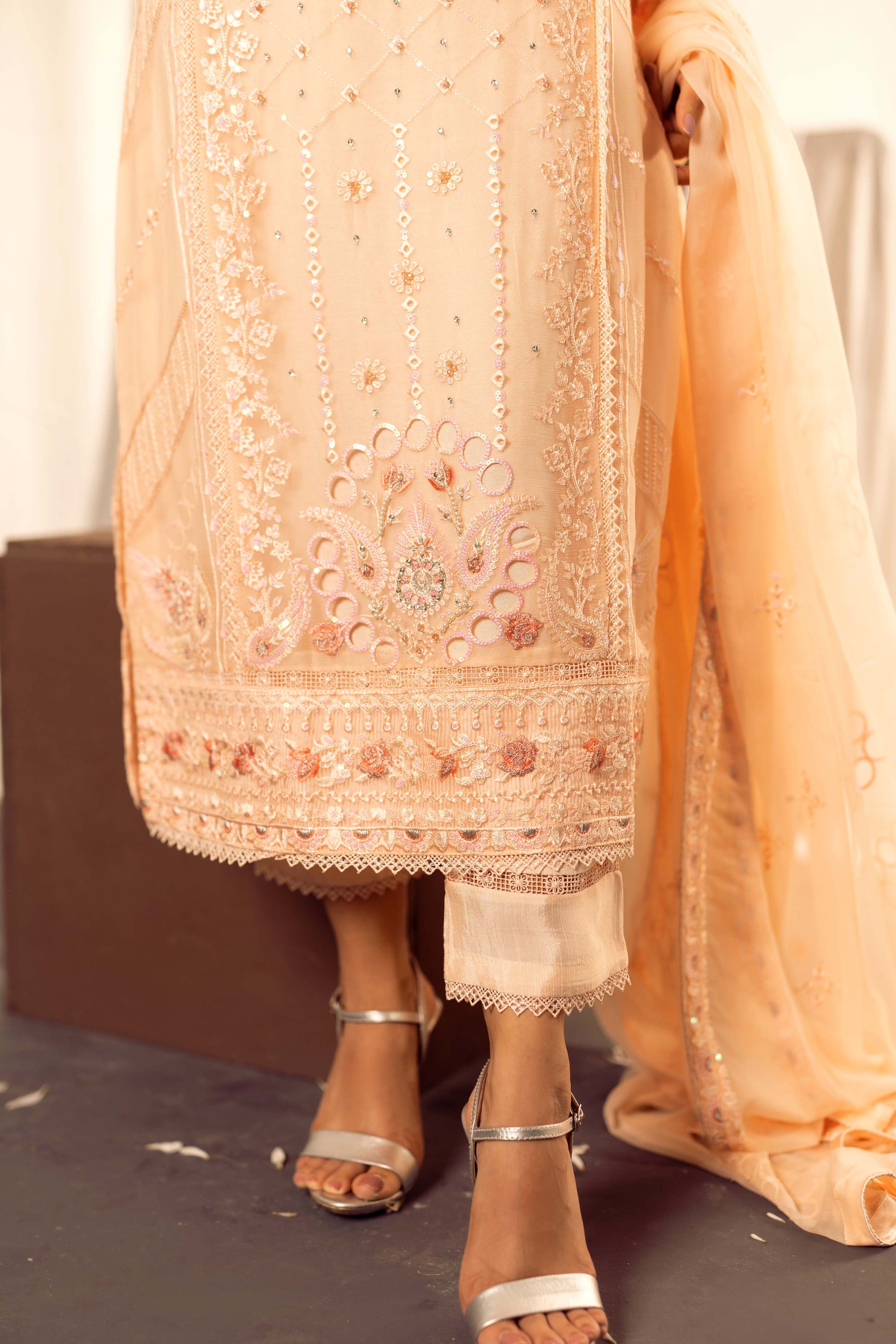 Dupatta: A flowing chiffon dupatta, beautifully embroidered and finished with four-sided silk dori piping, offering a touch of luxury.