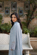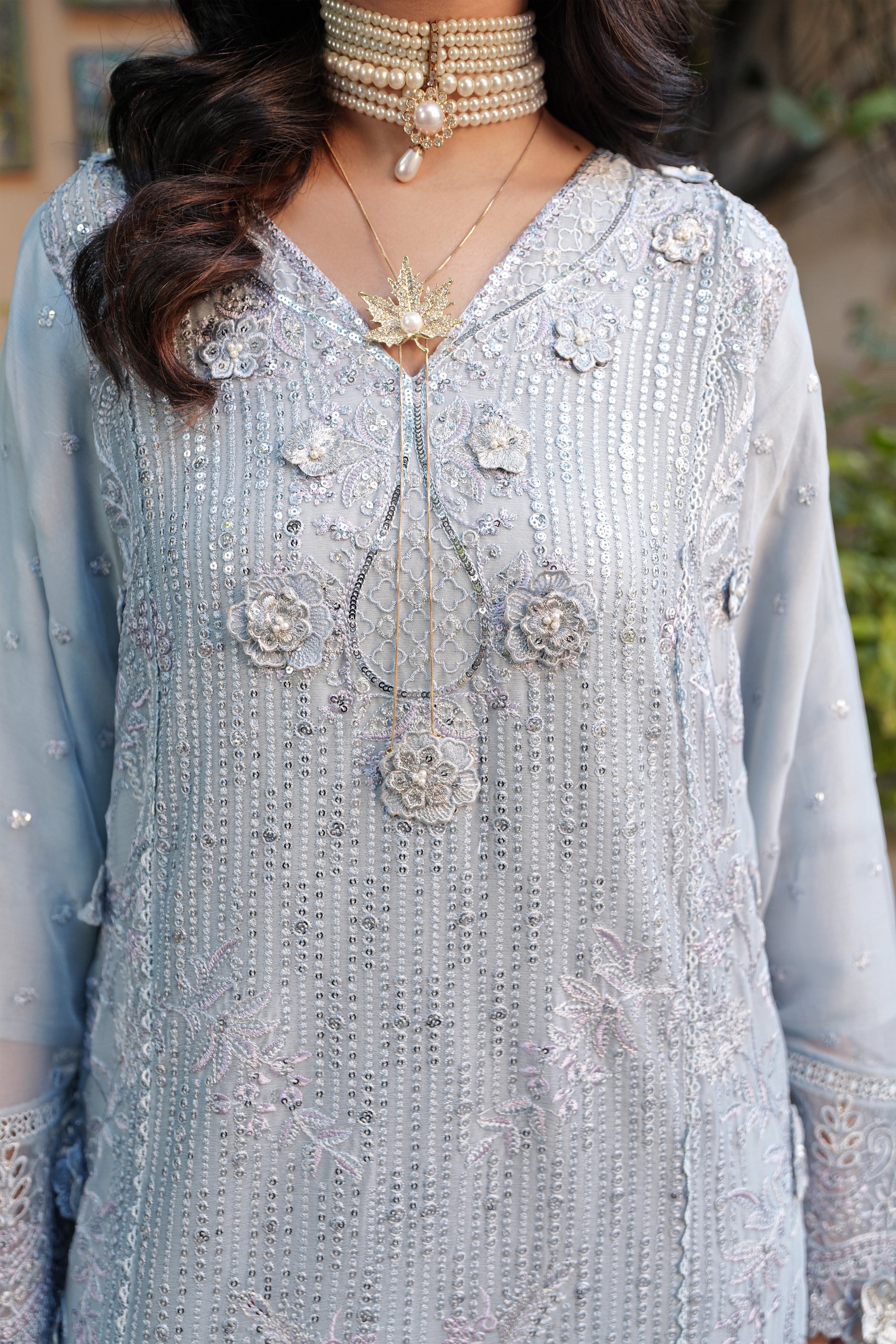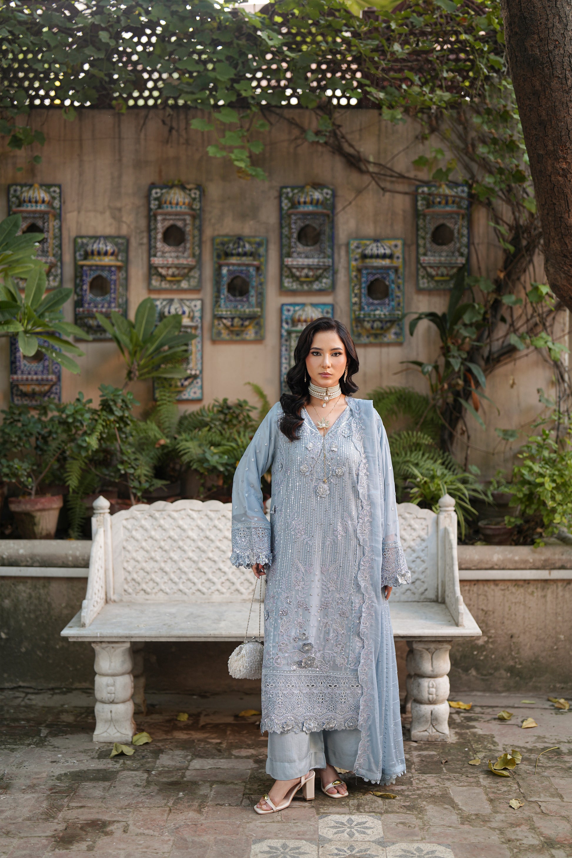 An embroidered chiffon dupatta adds ethereal charm, enhanced with intricate threadwork and fine finishing that complete the look with finesse.