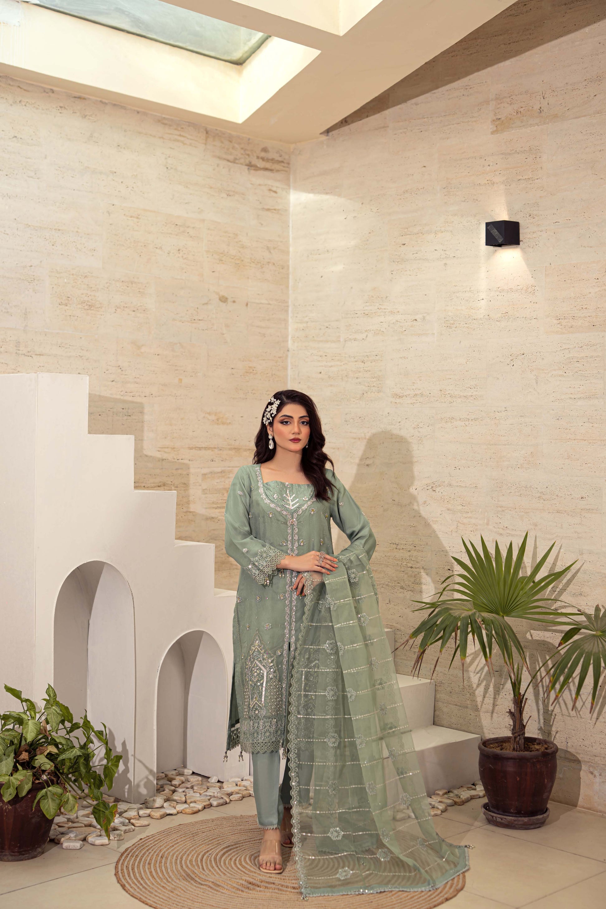 - Shirt: Luxurious organza, adorned with exquisite embroidery, intricate handwork, and delicate lace details, complemented by a soft viscose inner for unmatched comfort.