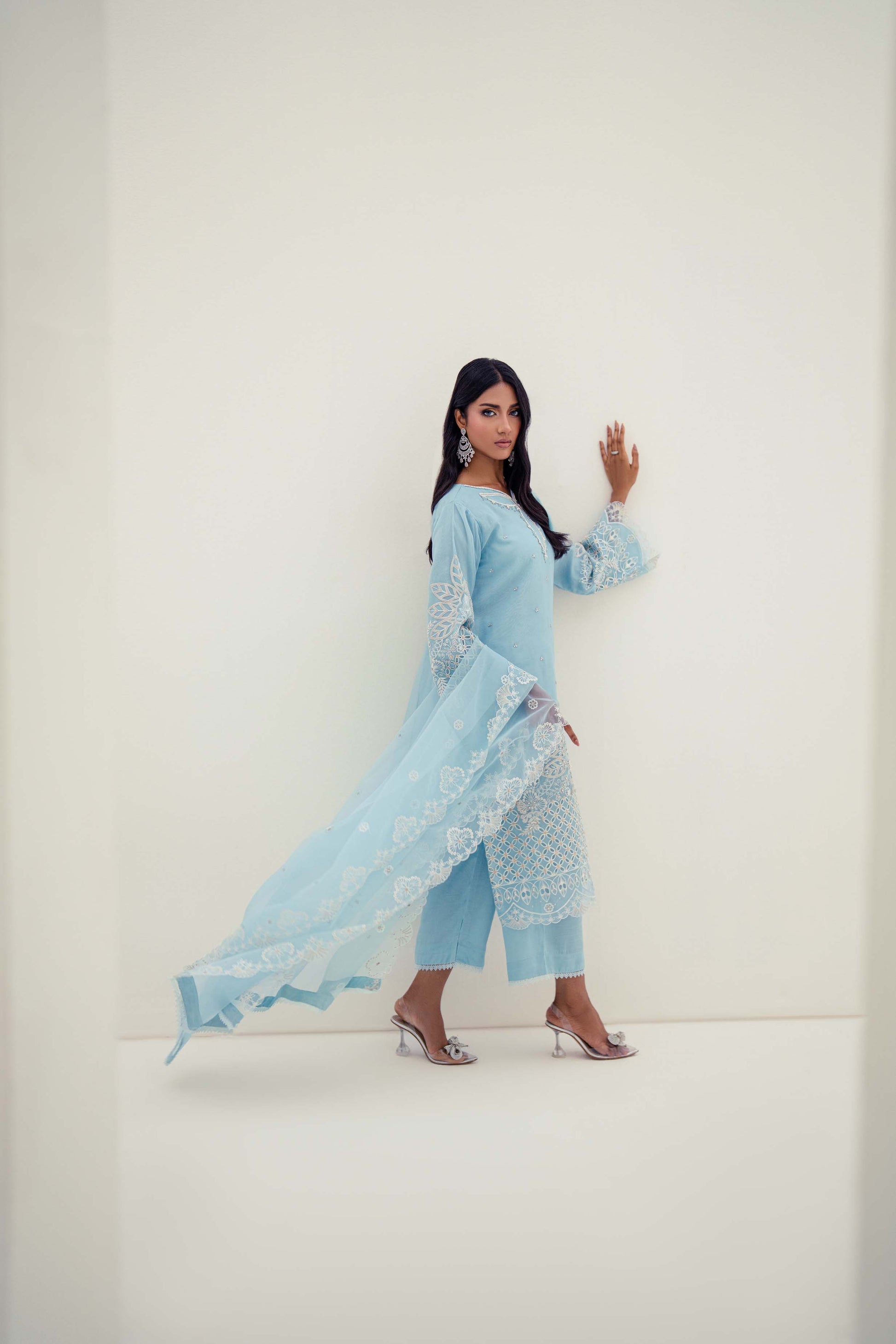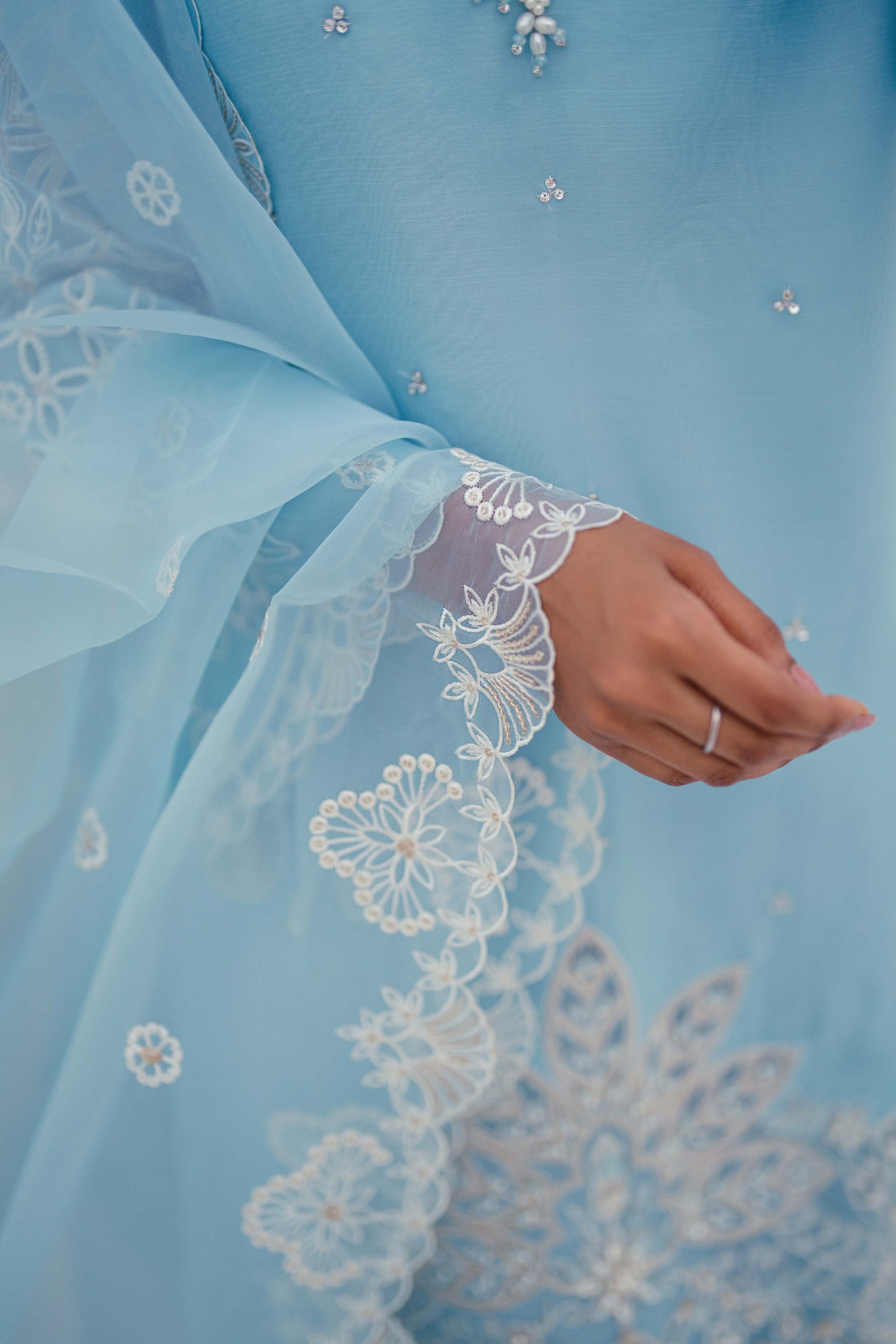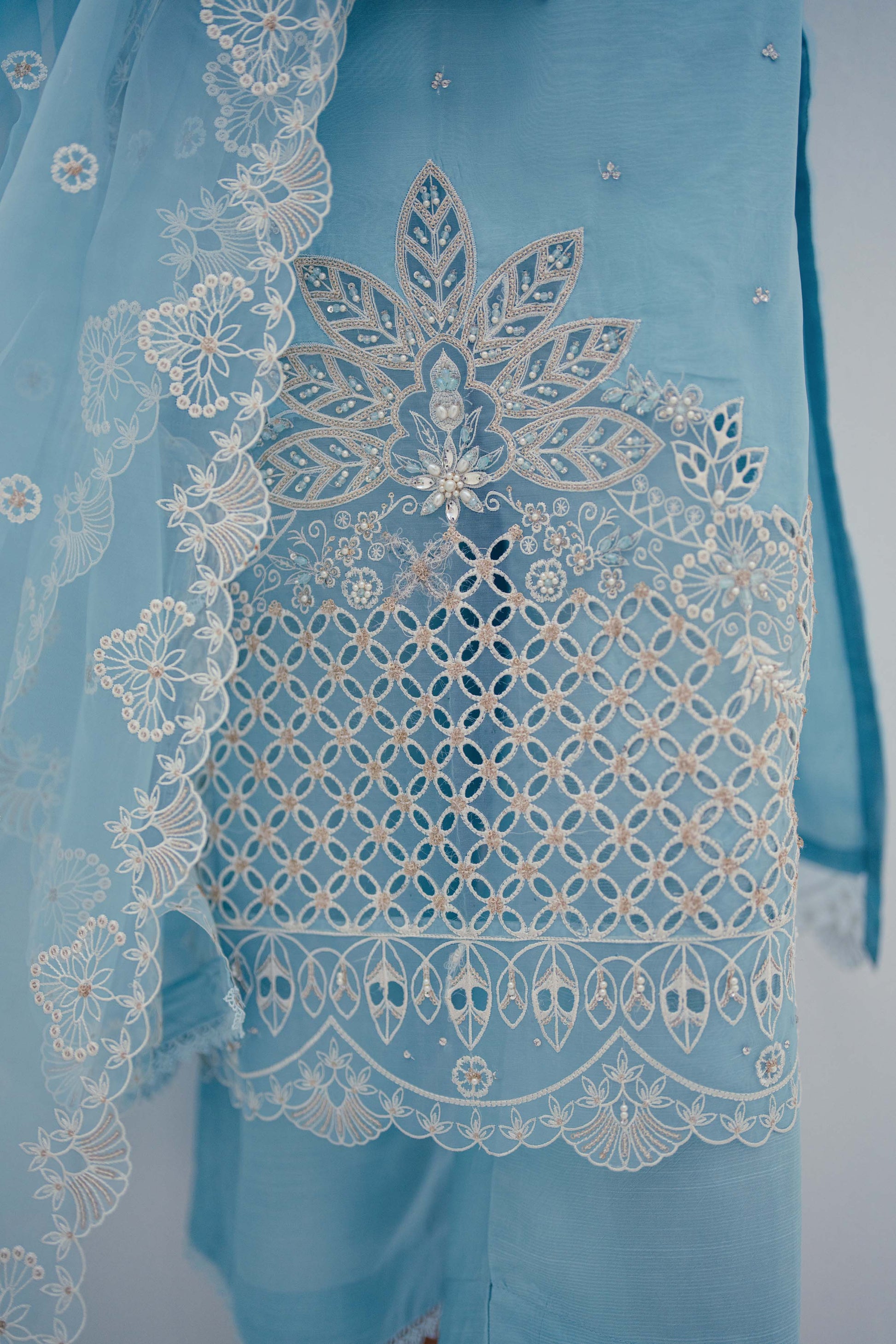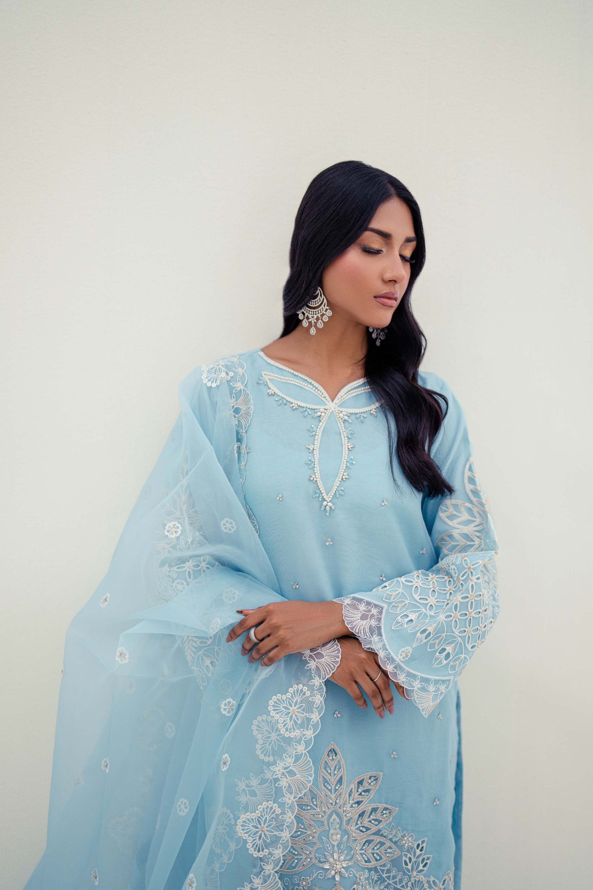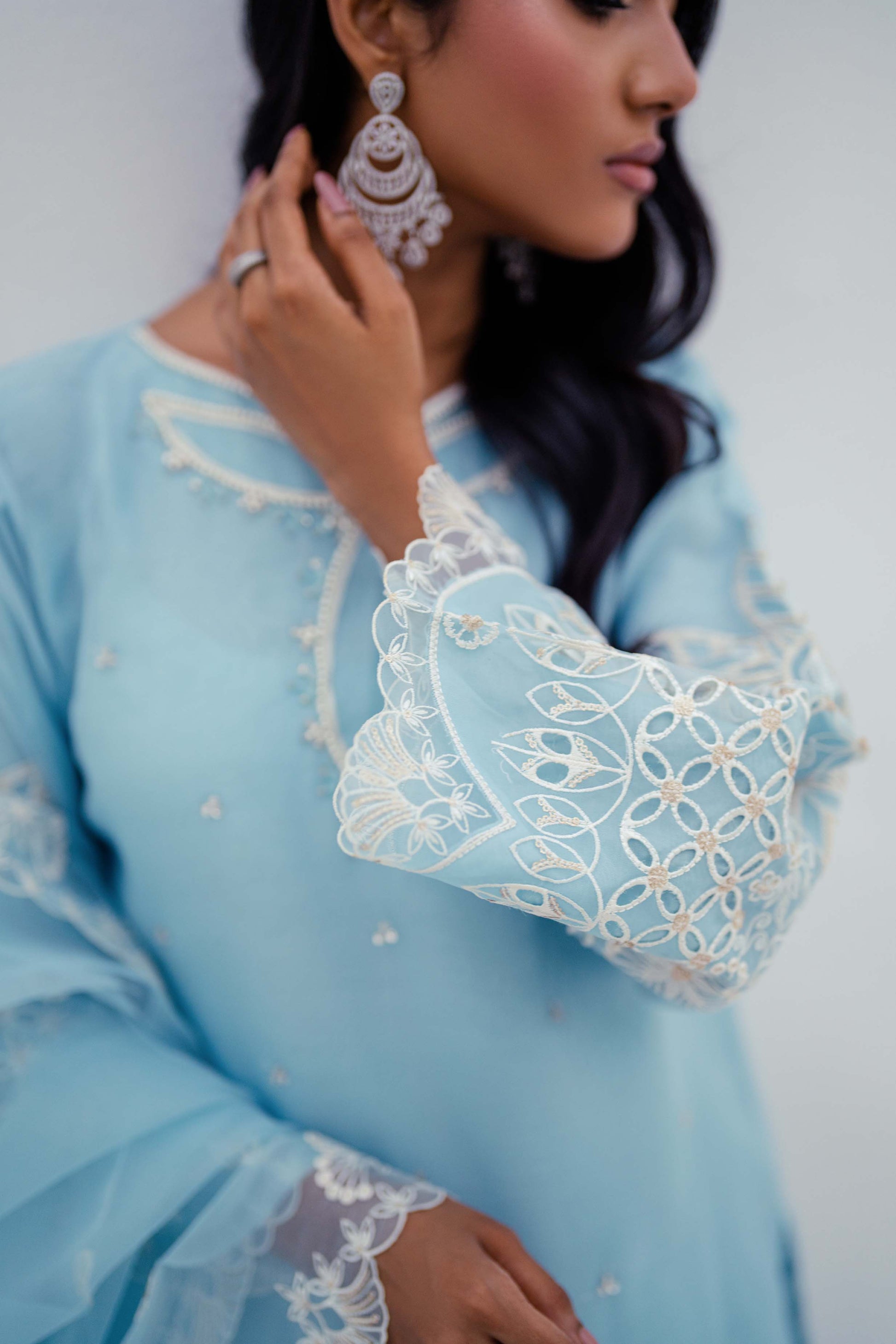 Dupatta: An organza dupatta with refined embroidery and lace accents, creating a flowing, graceful silhouette.