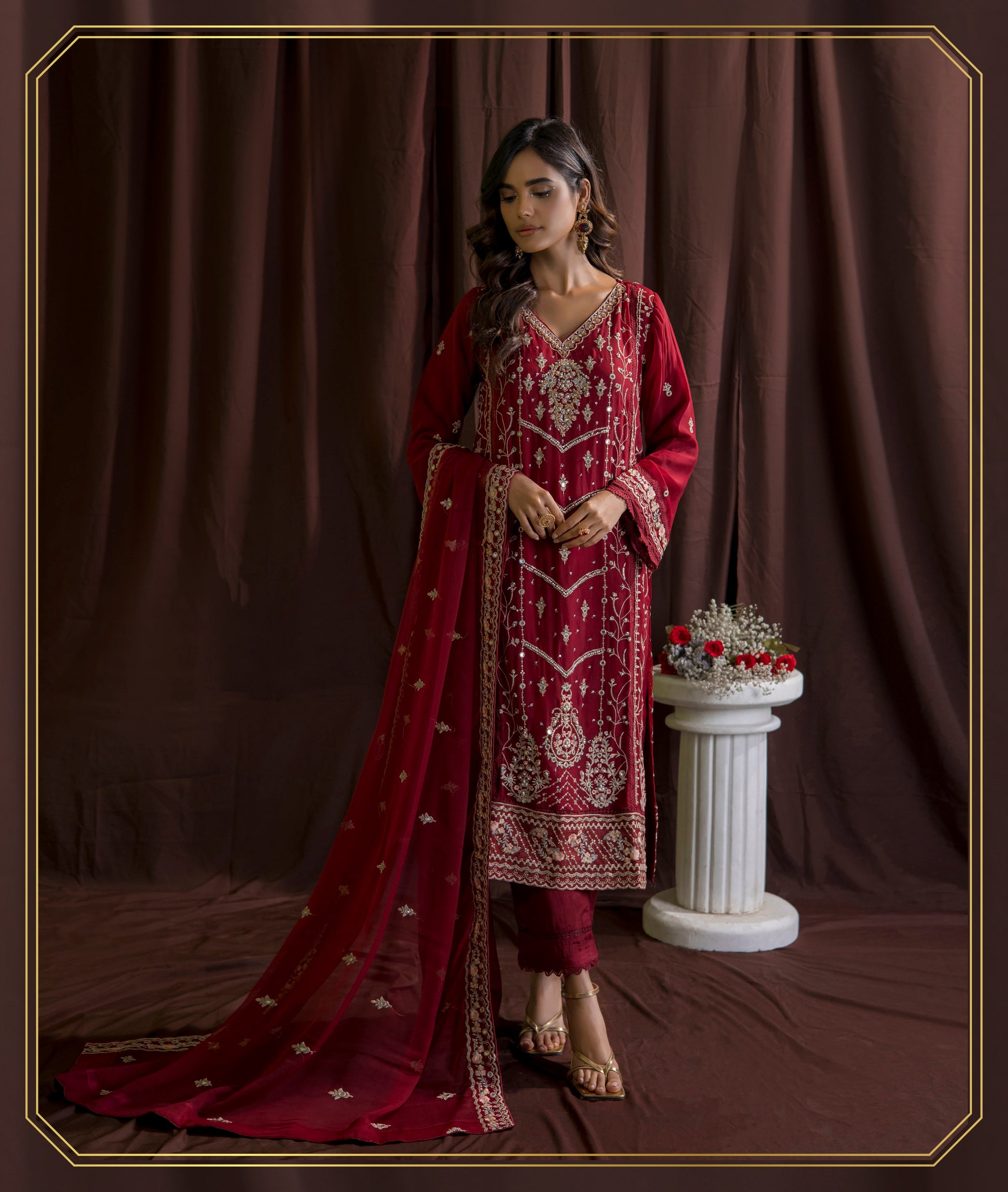 Dupatta: Pure chiffon featuring elegant embroidery and enhanced with a 4-sided silk Dori piping for a touch of opulence.