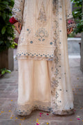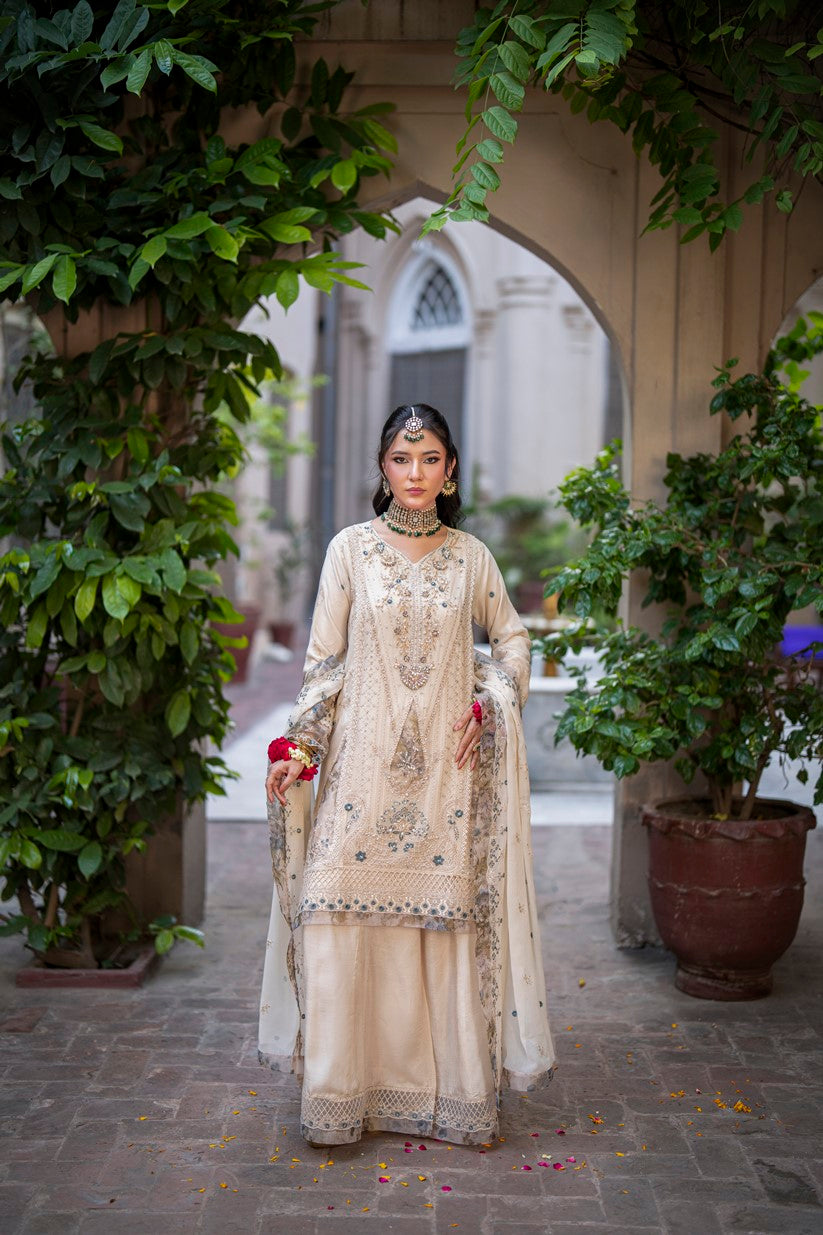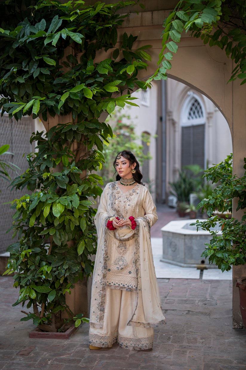 Shirt: Designed in delicately embroidered chiffon, the shirt features refined neckline craftsmanship, subtle hand-applied details, lace accents, cutwork touches, and a printed organza patch. A soft viscose inner enhances comfort while maintaining a smooth, elevated finish.