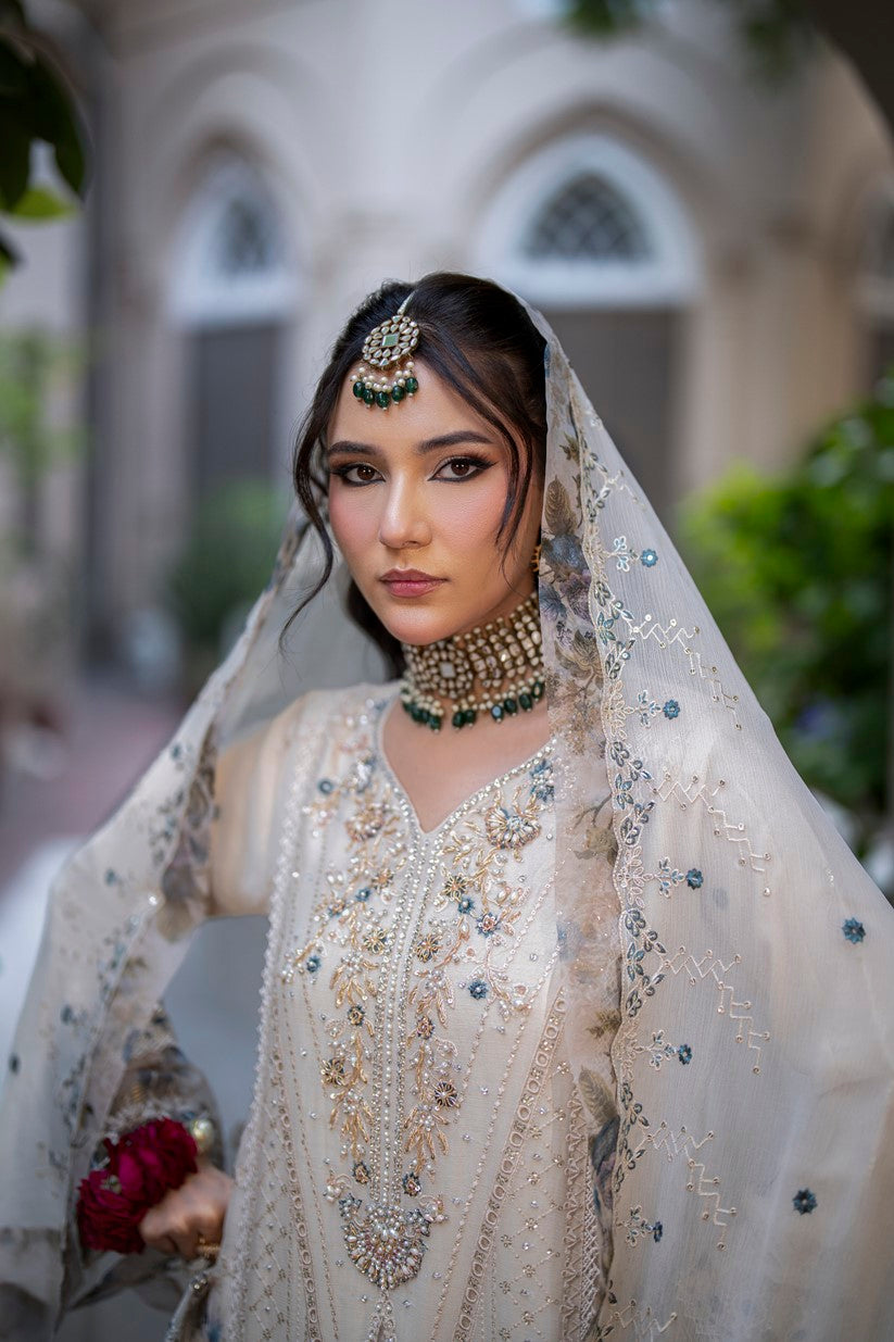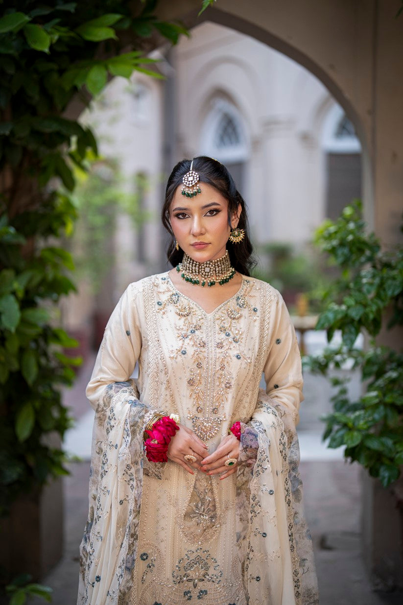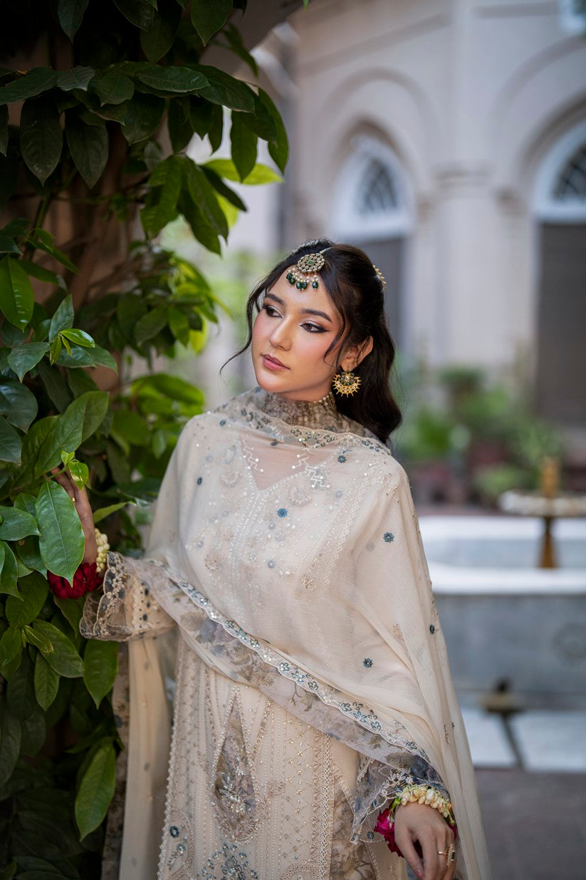 Dupatta: The chiffon dupatta is adorned with graceful embroidery and cutwork, complemented by a striking printed organza border on all four sides — adding depth, elegance, and movement to the ensemble..