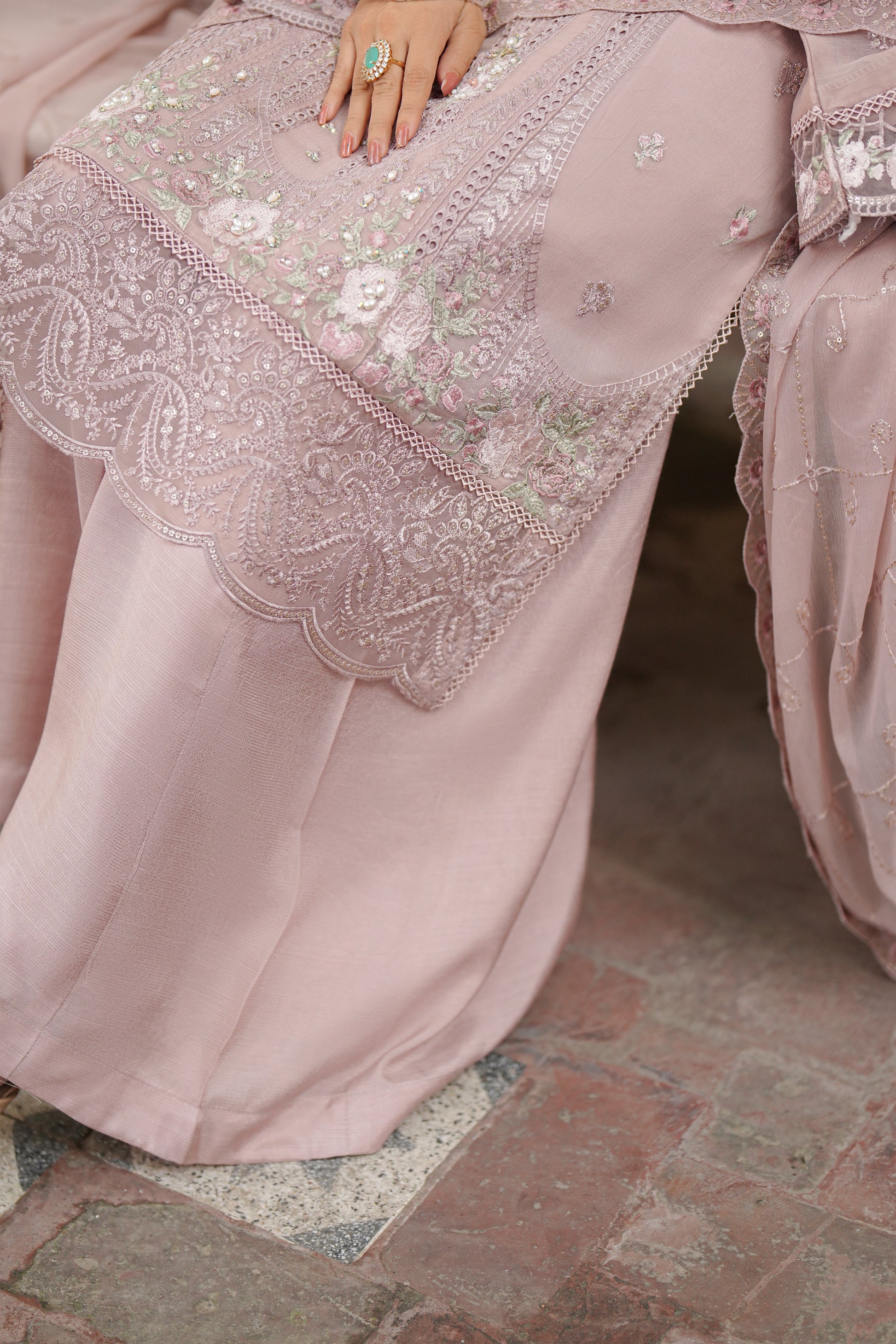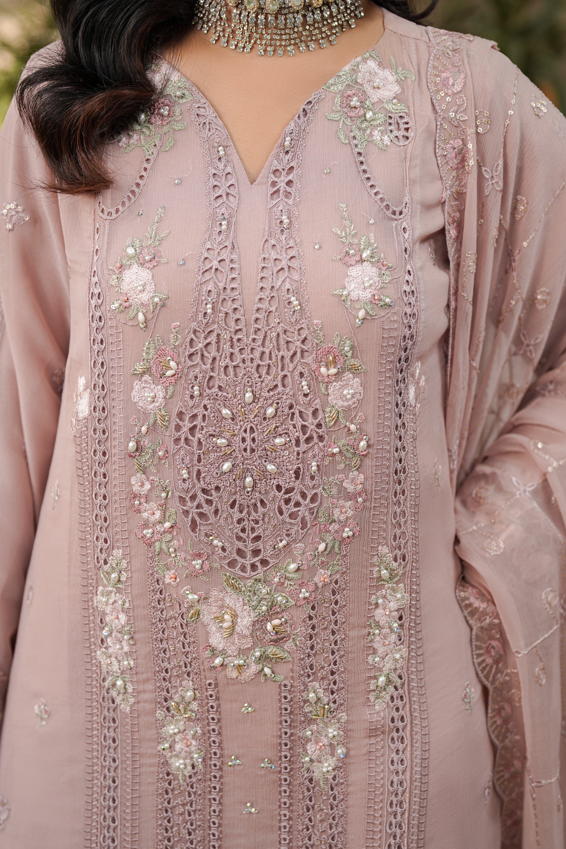 A beautifully embroidered chiffon dupatta adds an air of sophistication and completes the outfit with timeless charm.