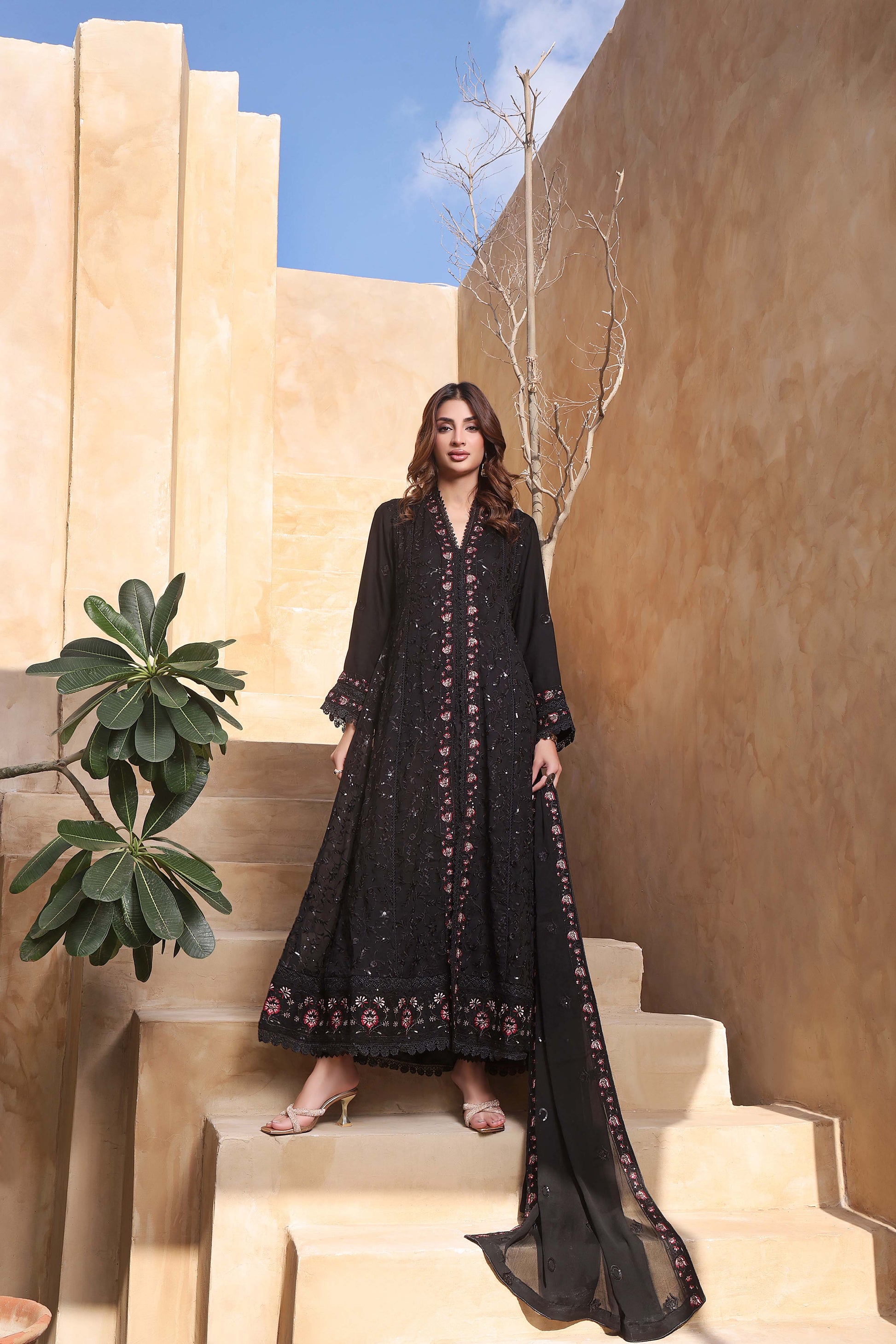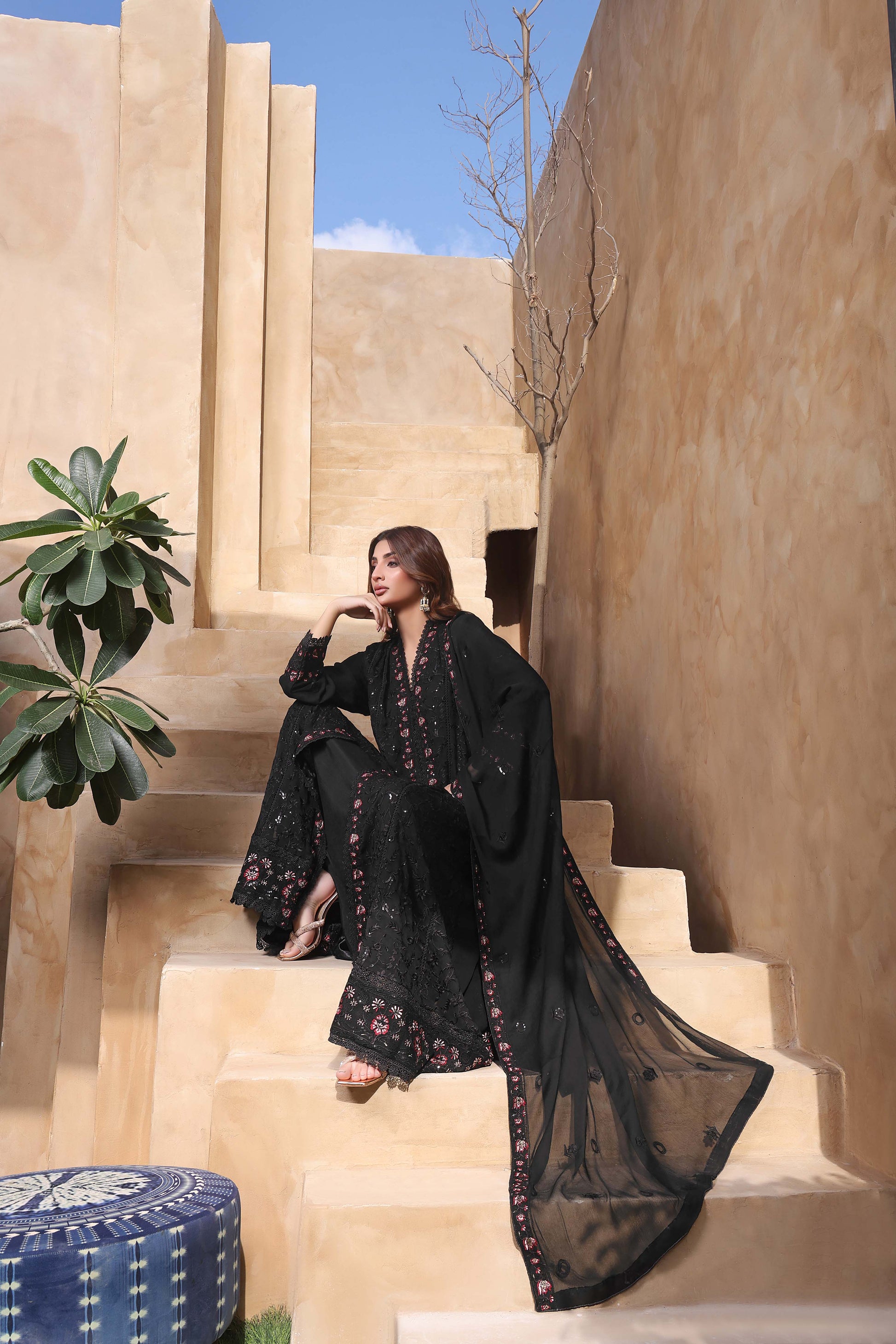 Maxi: Exquisite chiffon maxi beautifully adorned with delicate embroidery, elegant neckline handwork, and fine lacework. Designed with a soft viscose inner for comfort and sophistication.