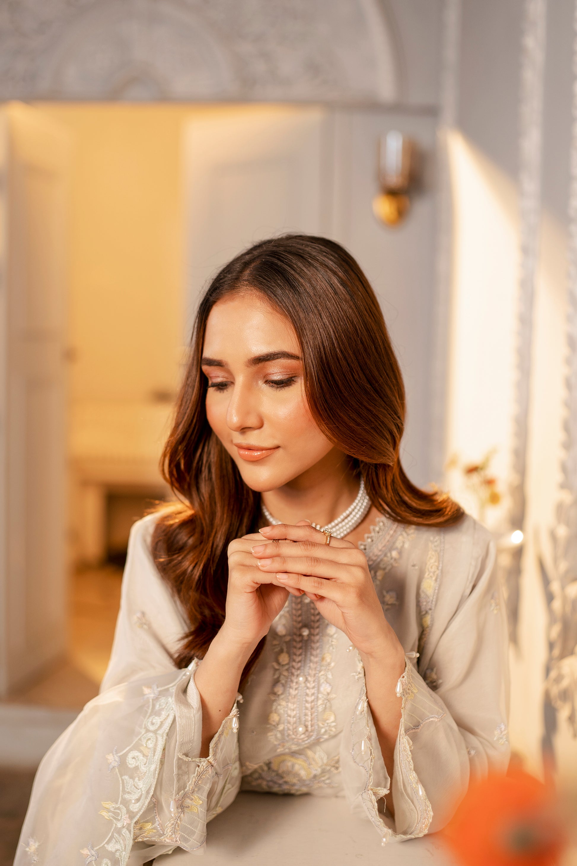 Shirt: Opulent organza adorned with exquisite embroidery, intricate handwork, lace detailing, and a stunning back embroidery. The soft viscose inner adds comfort to elegance.