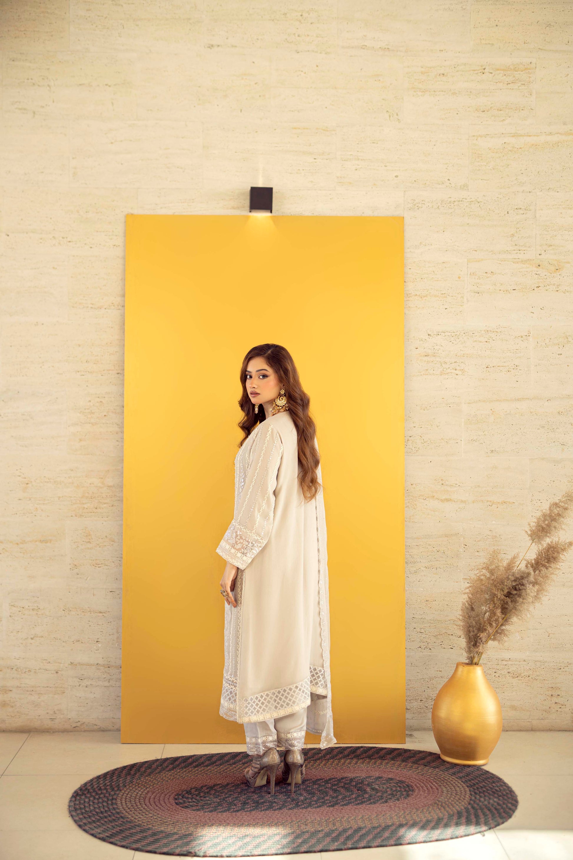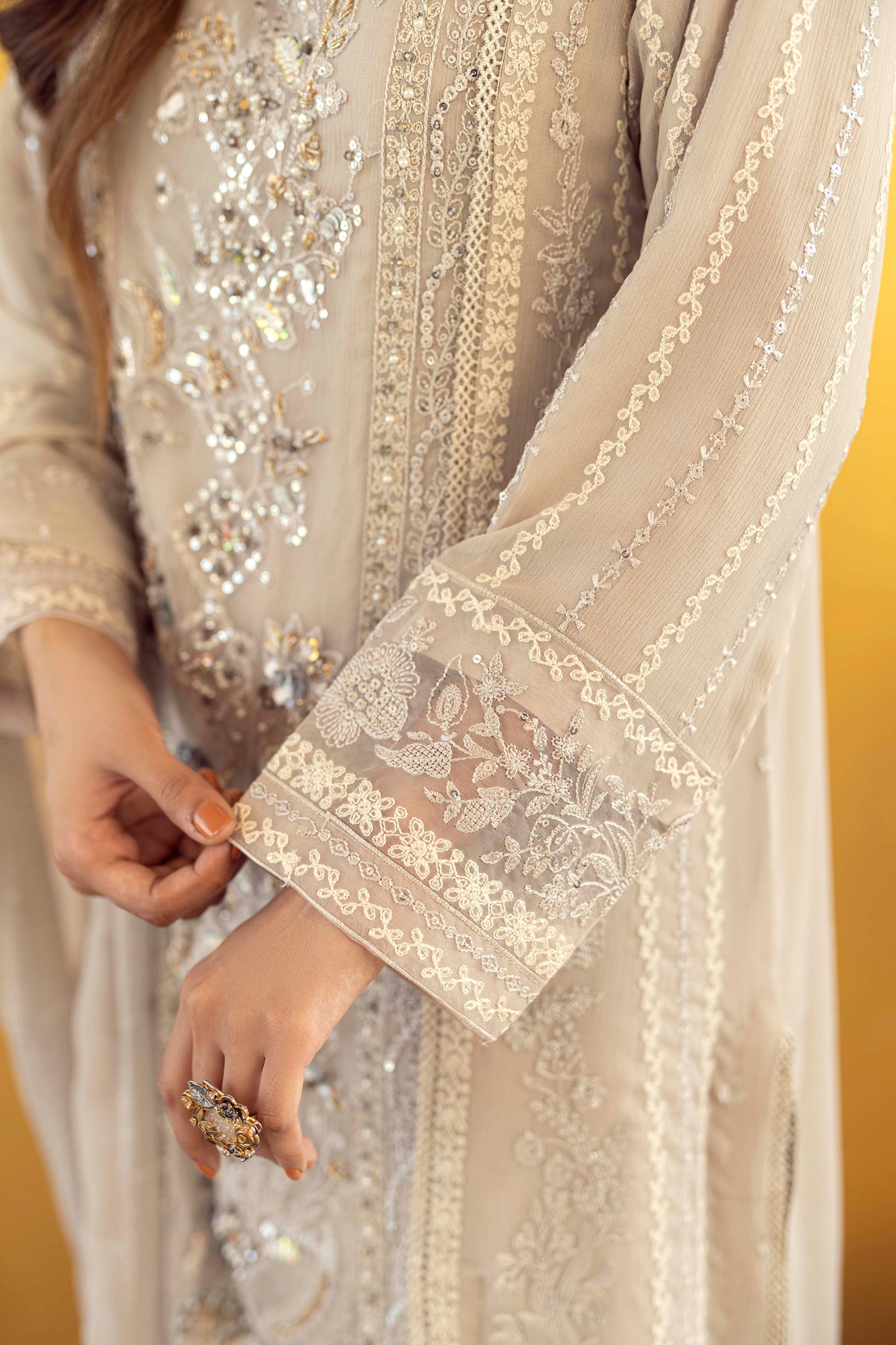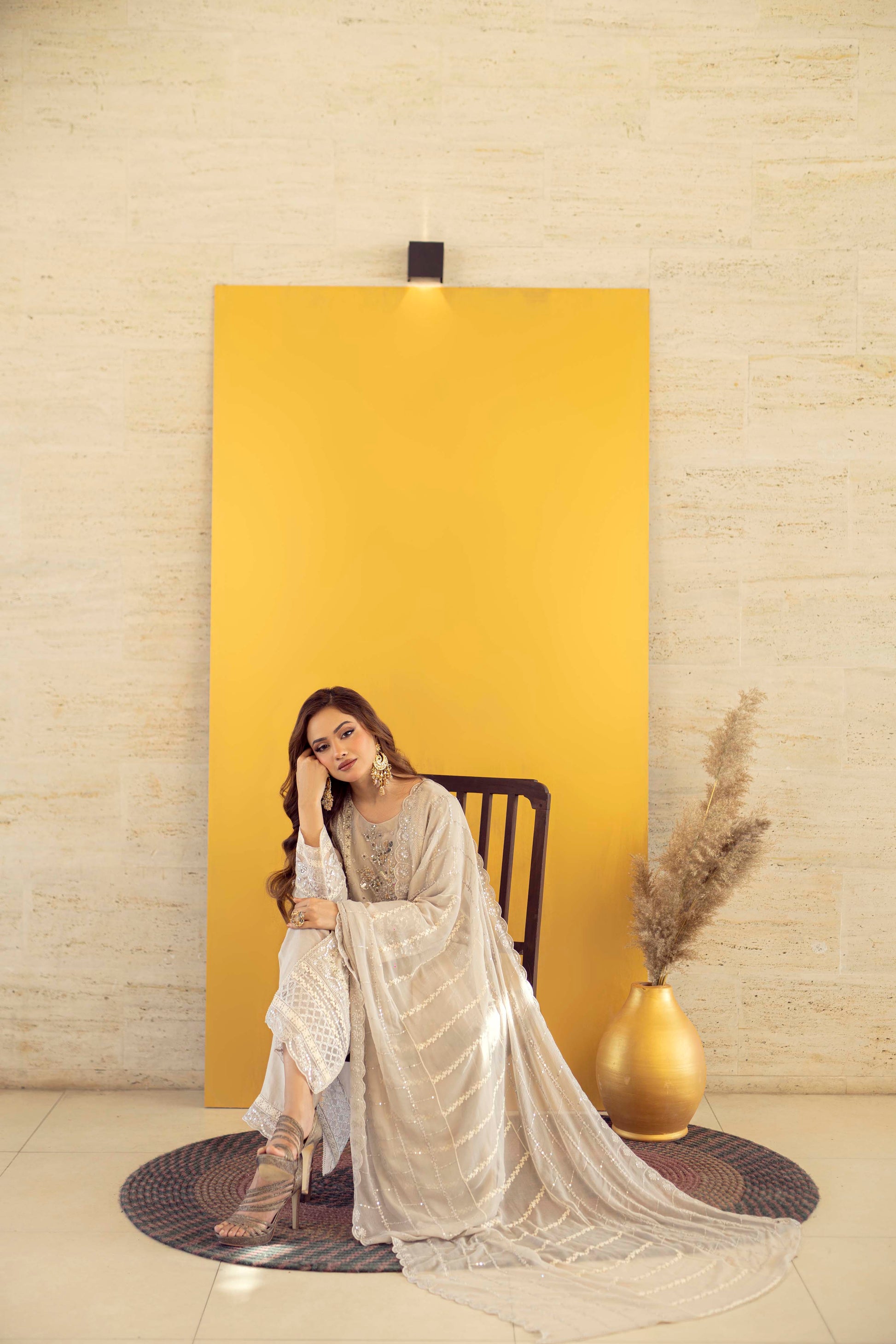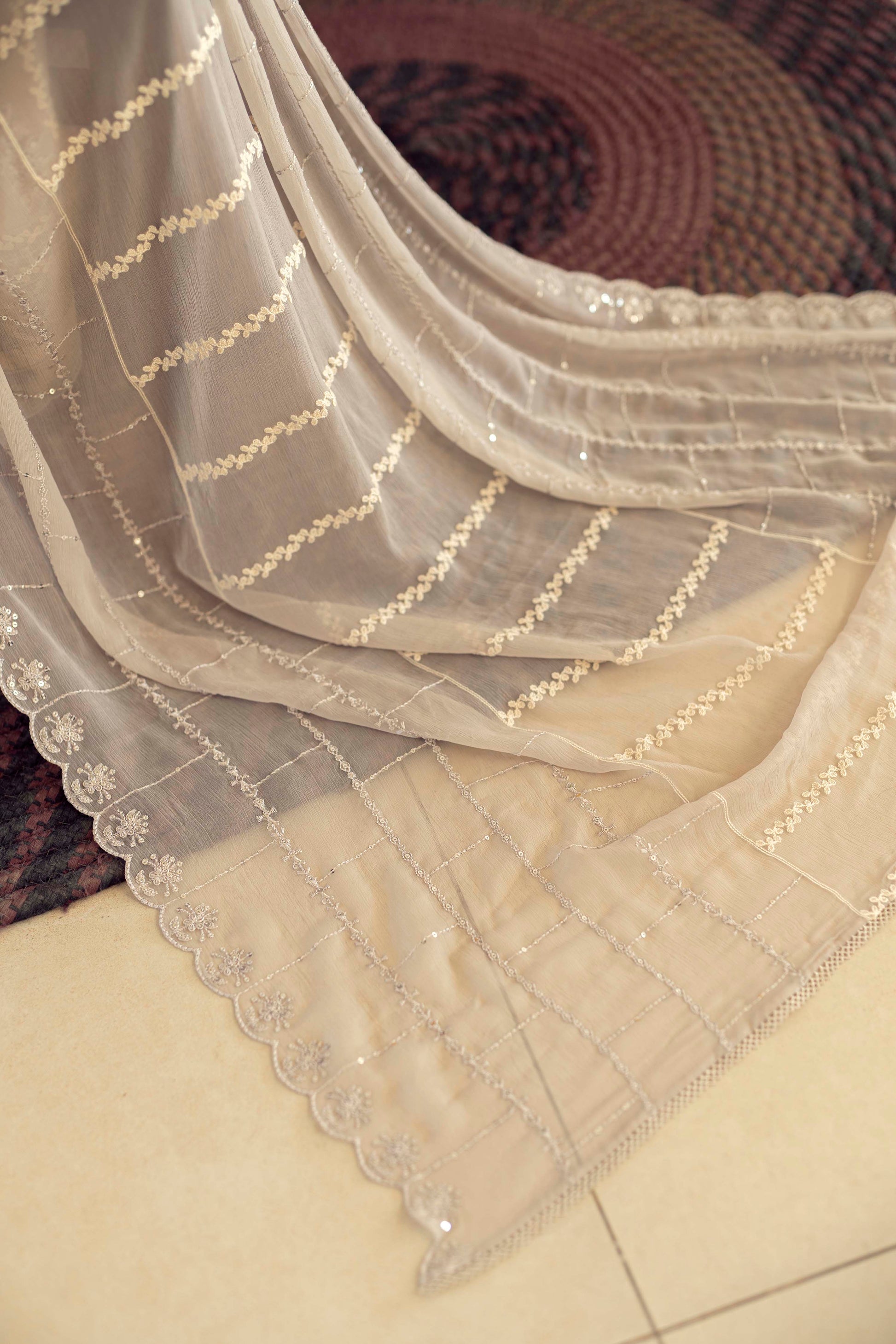 Dupatta: Embroidered chiffon, adorned with 4-side silk dori piping for a refined finish.