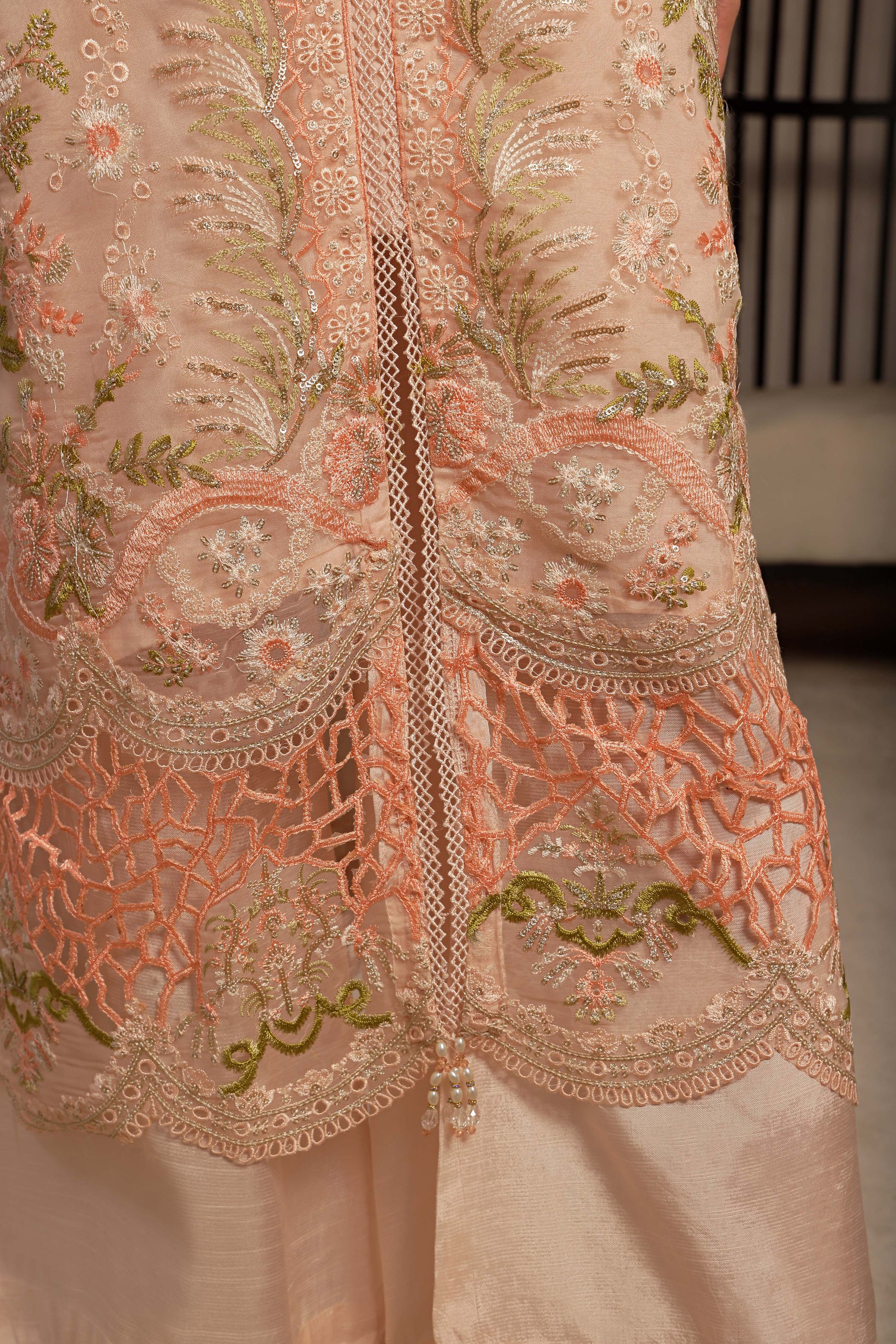 Shirt: Crafted from premium organza, featuring intricate embroidery, cutwork, full applique, handwork, and delicate lacework. Paired with a comfortable viscose inner for added refinement.
