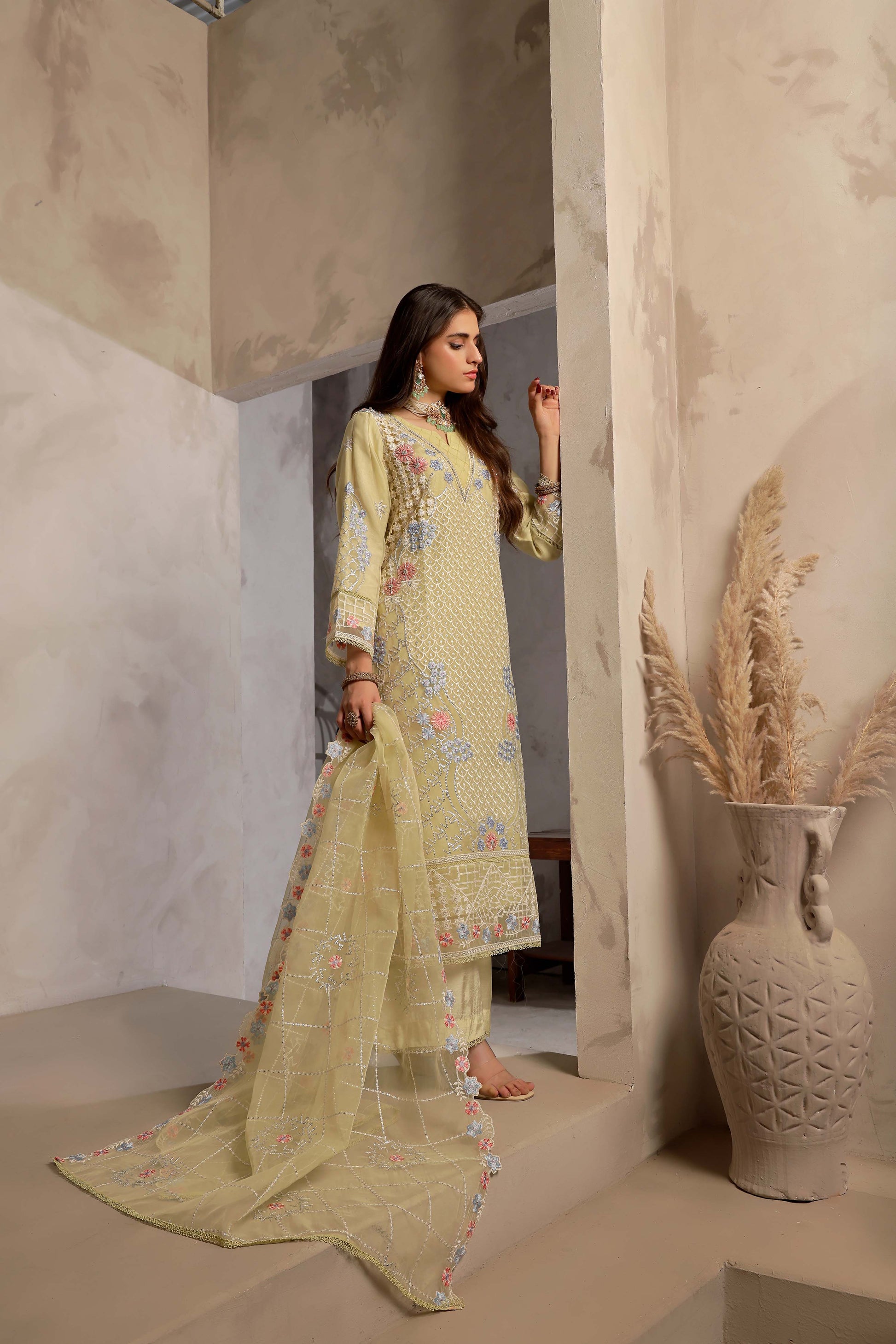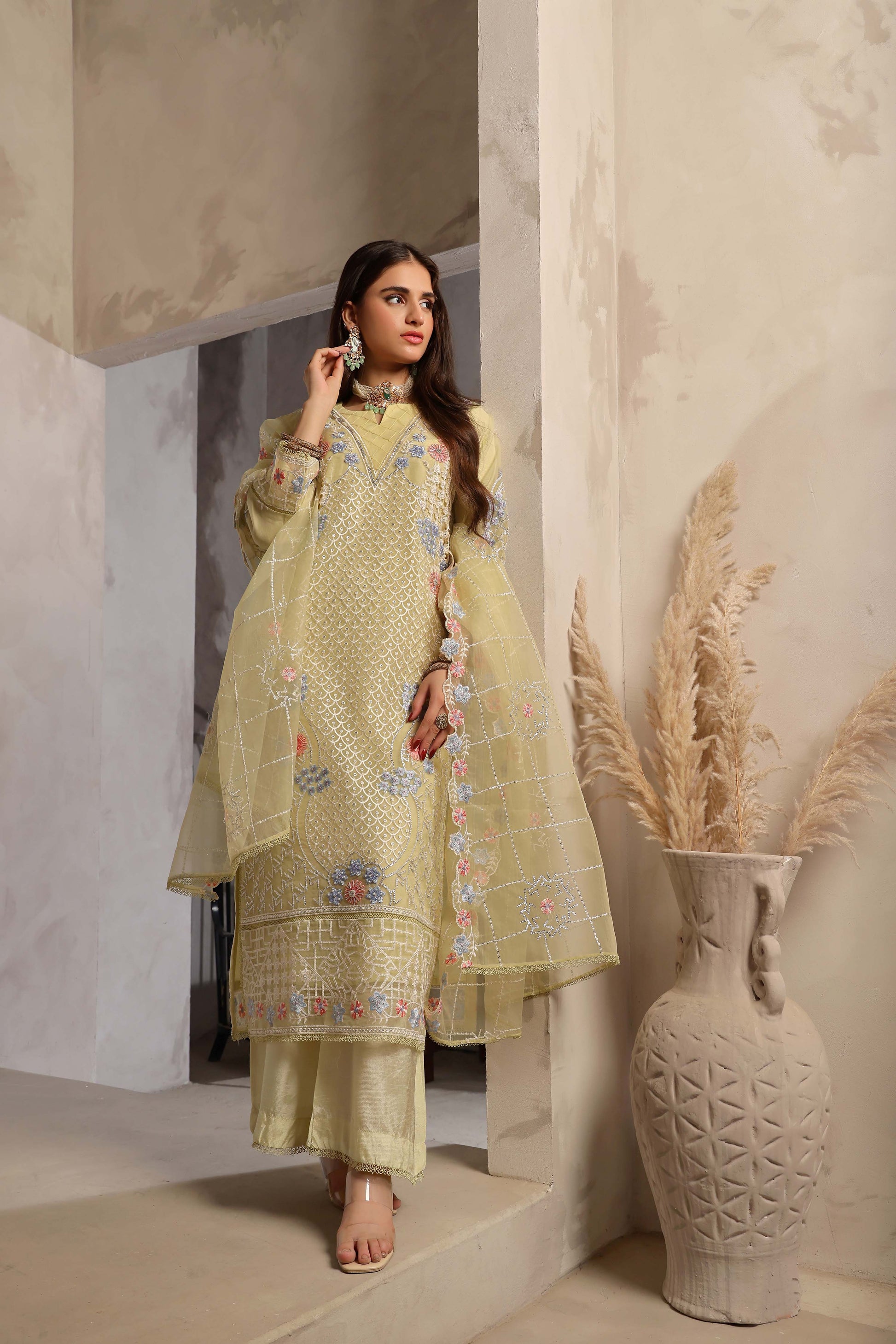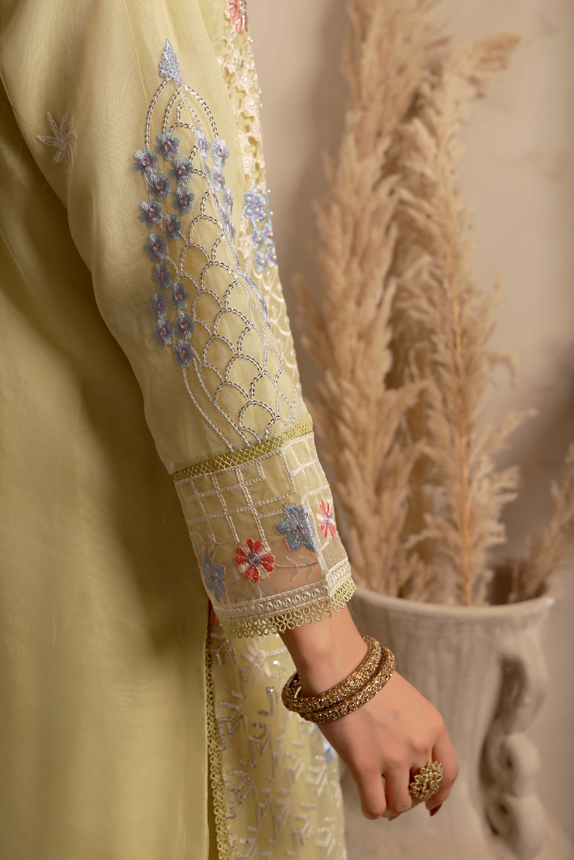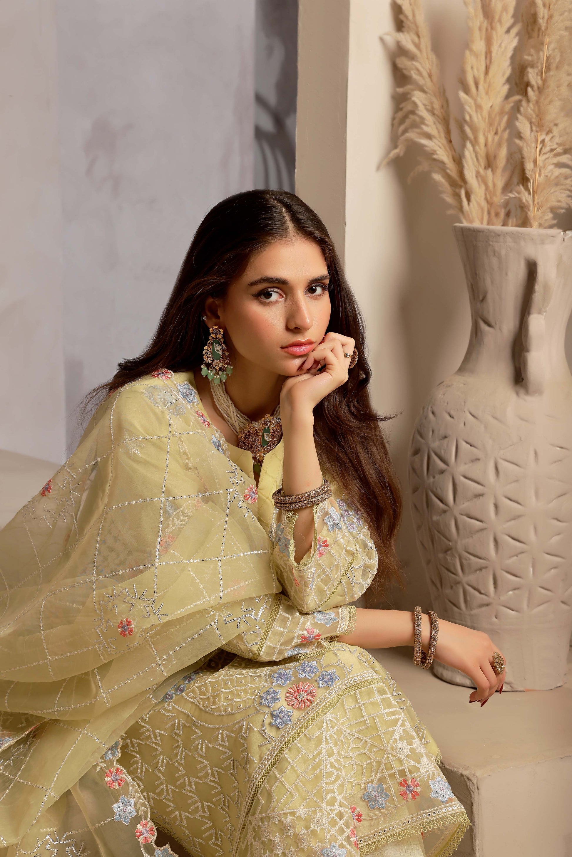 Dupatta: A graceful organza dupatta with elegant embroidery and lacework, adding a touch of sophistication.