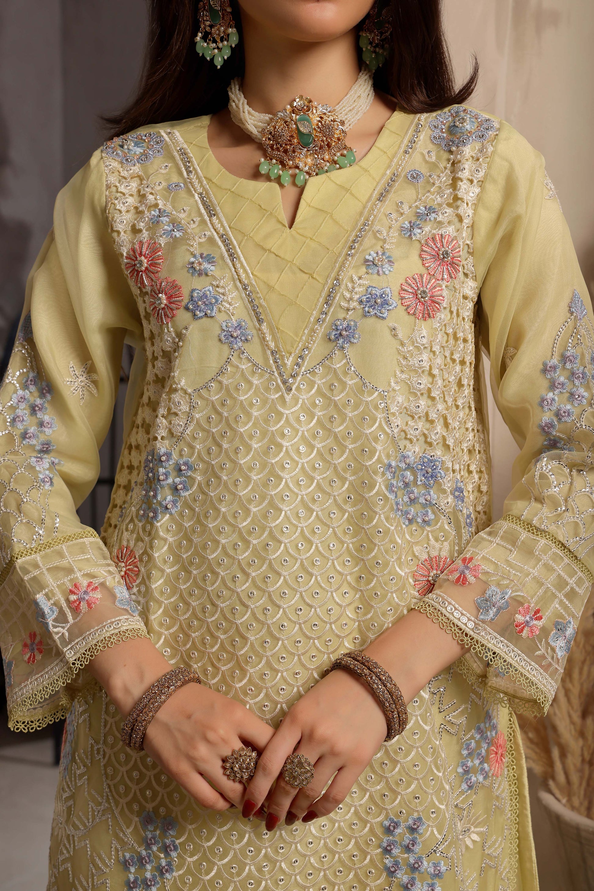 Shirt: Crafted from premium organza, featuring intricate embroidery, cutwork, full applique, handwork, and delicate lacework. Paired with a comfortable viscose inner for added refinement.