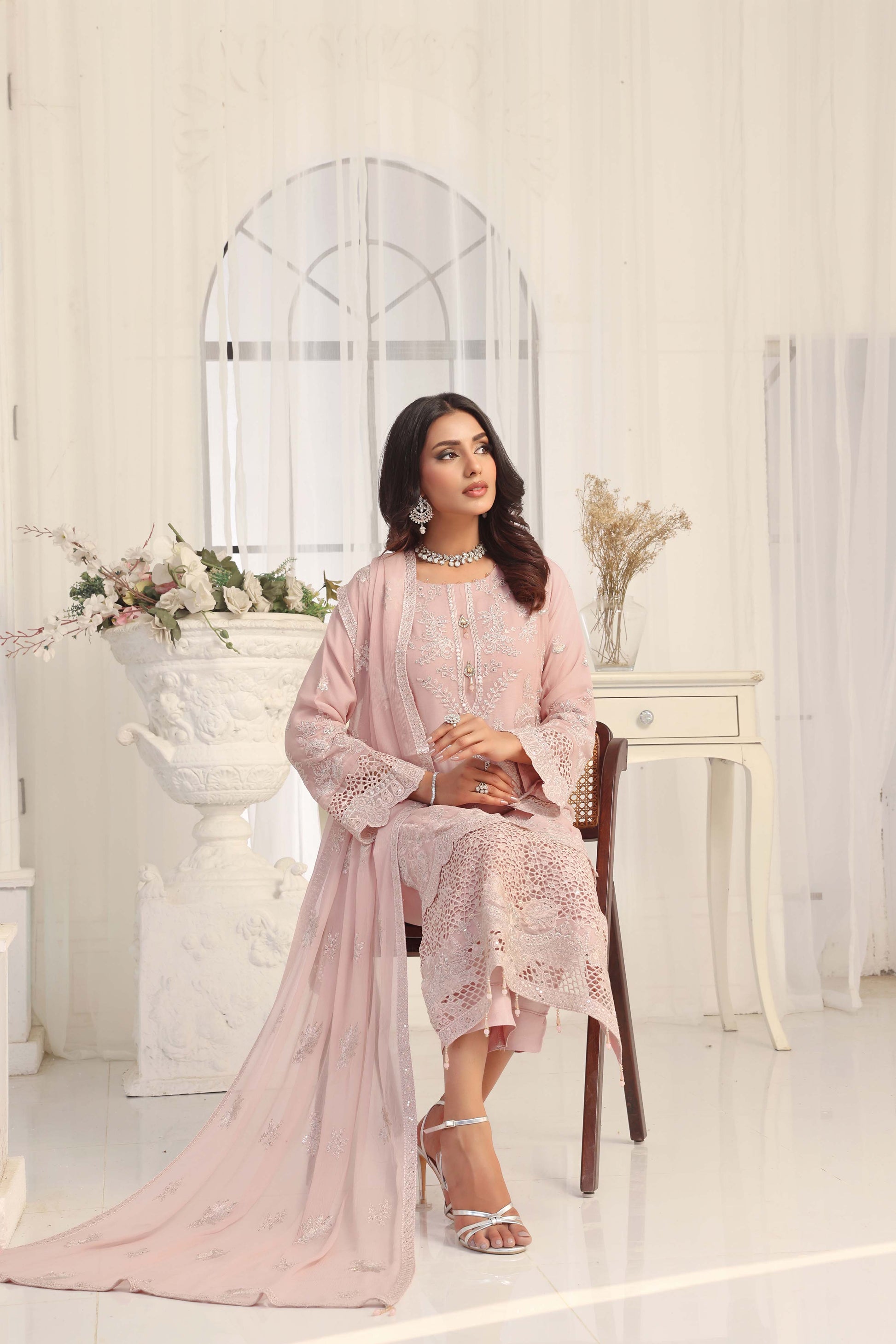 An ethereal blend of elegance and craftsmanship, the Seher Semi-Stitched Chiffon Ensemble is designed to elevate your formal wardrobe.