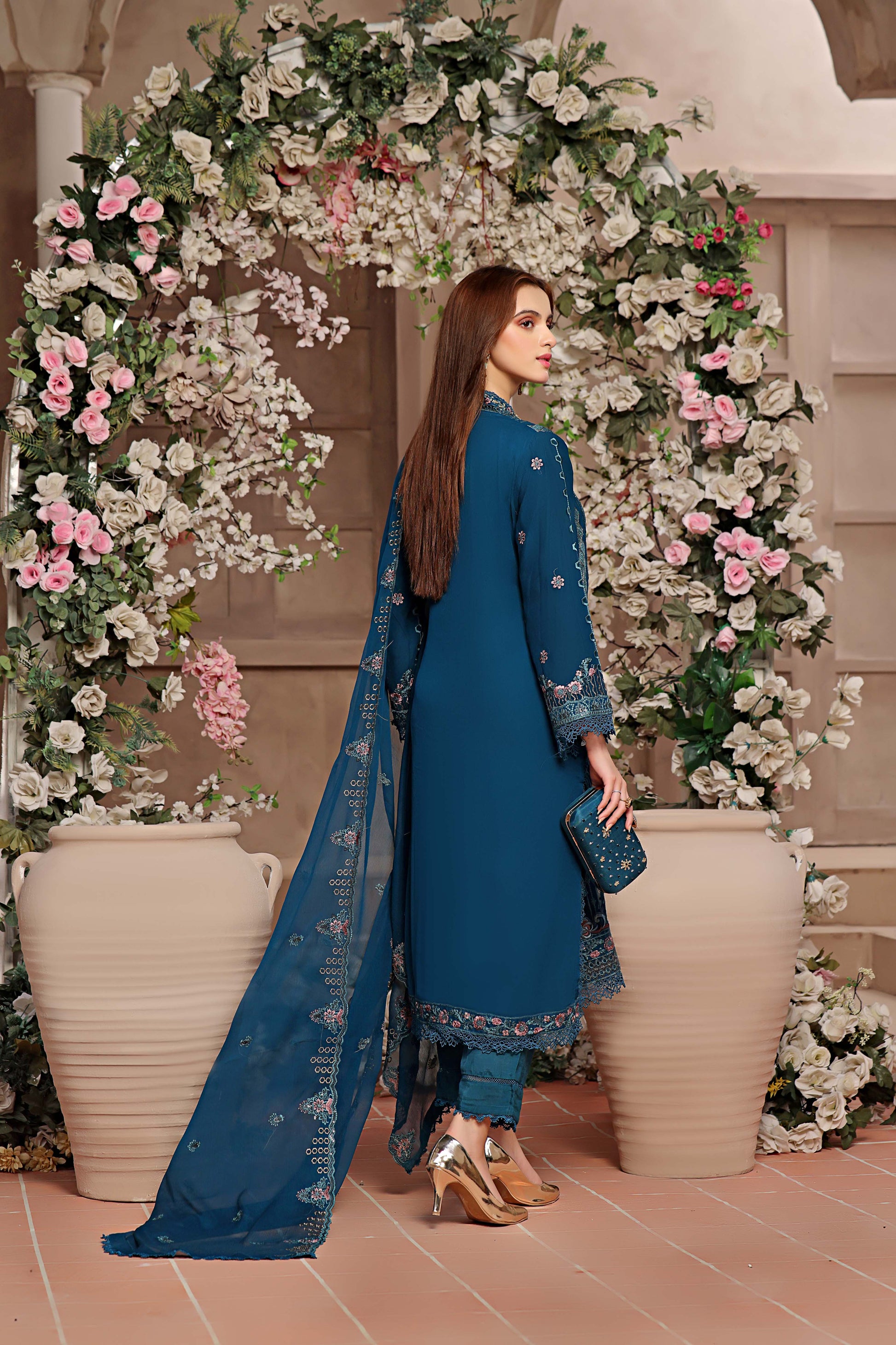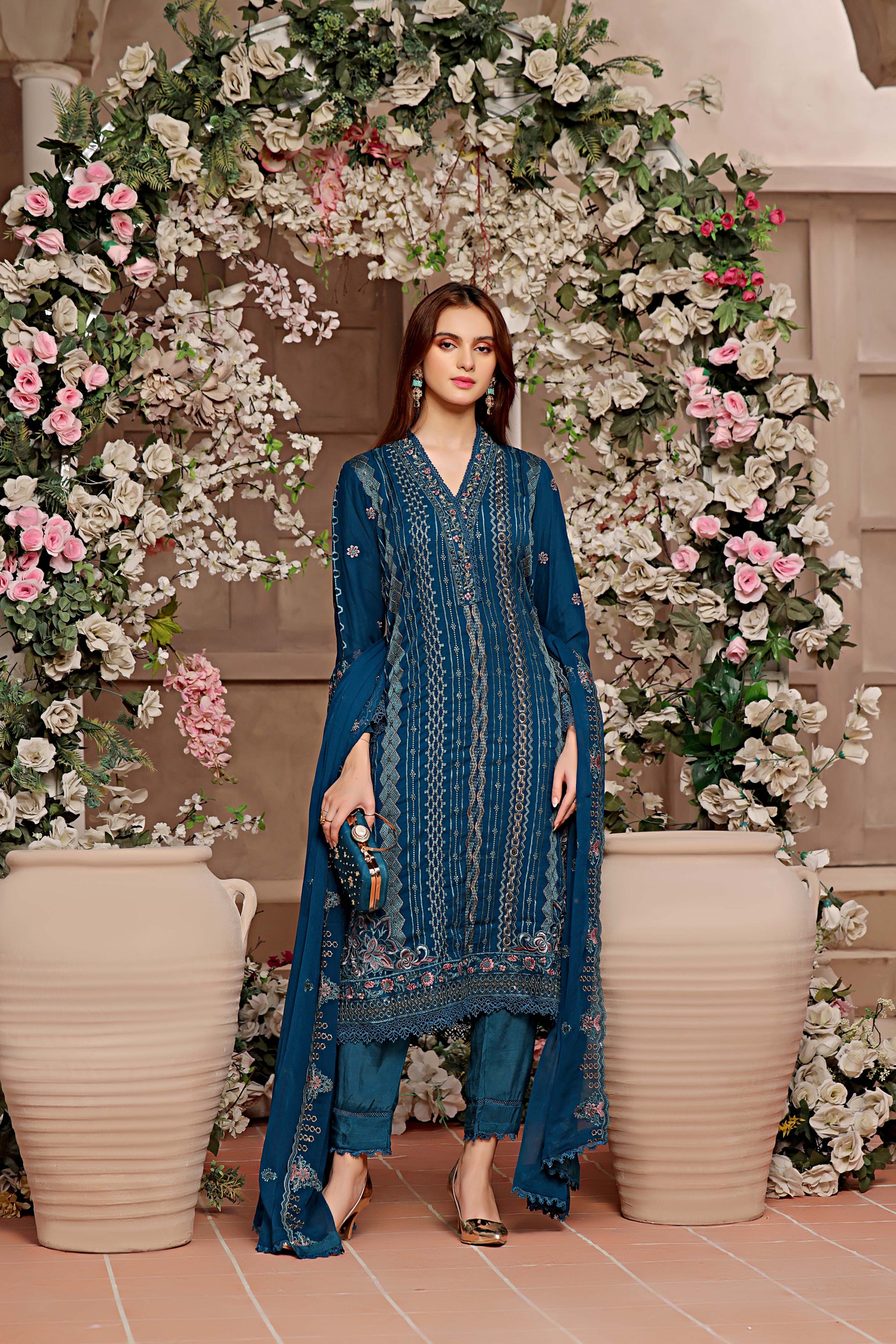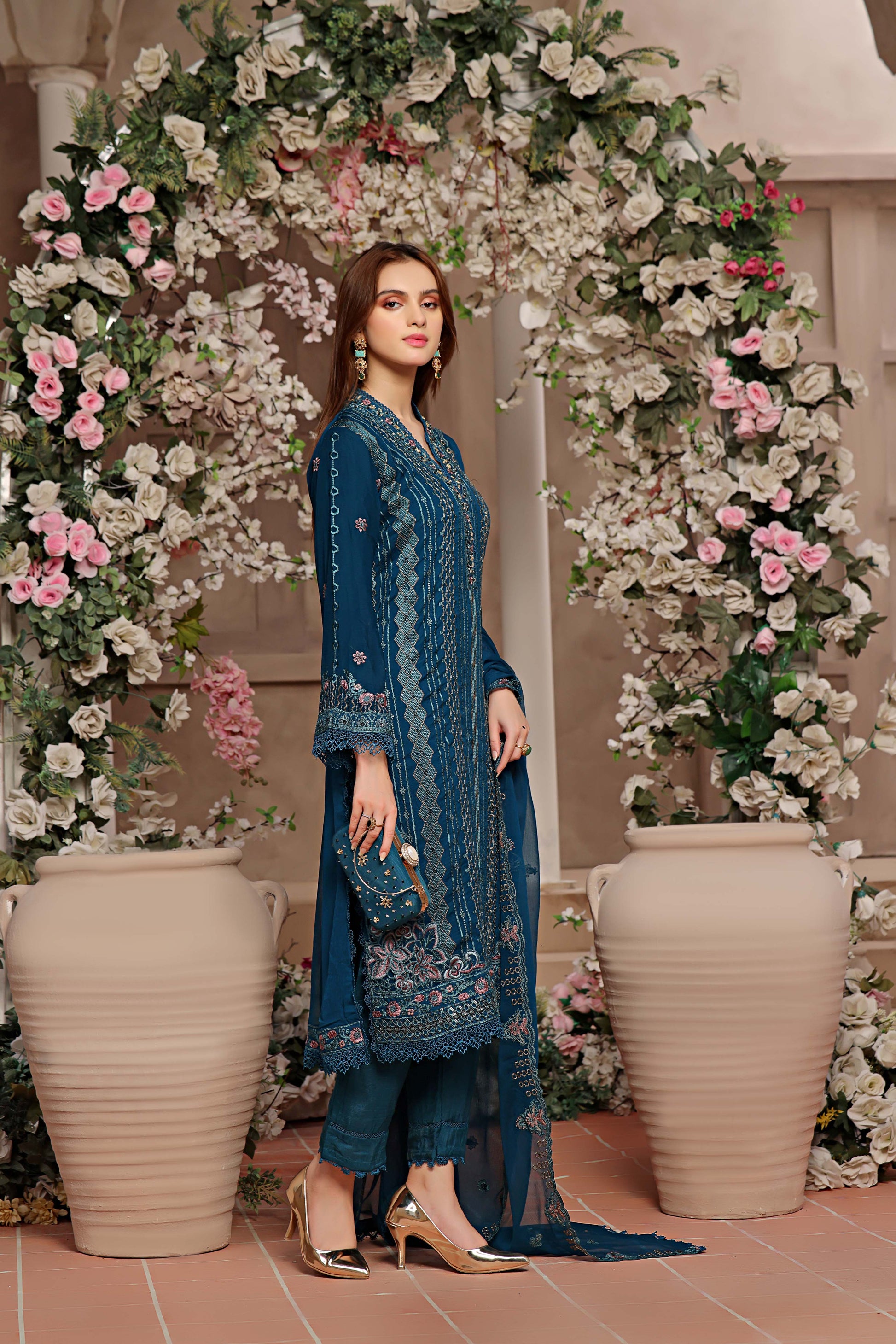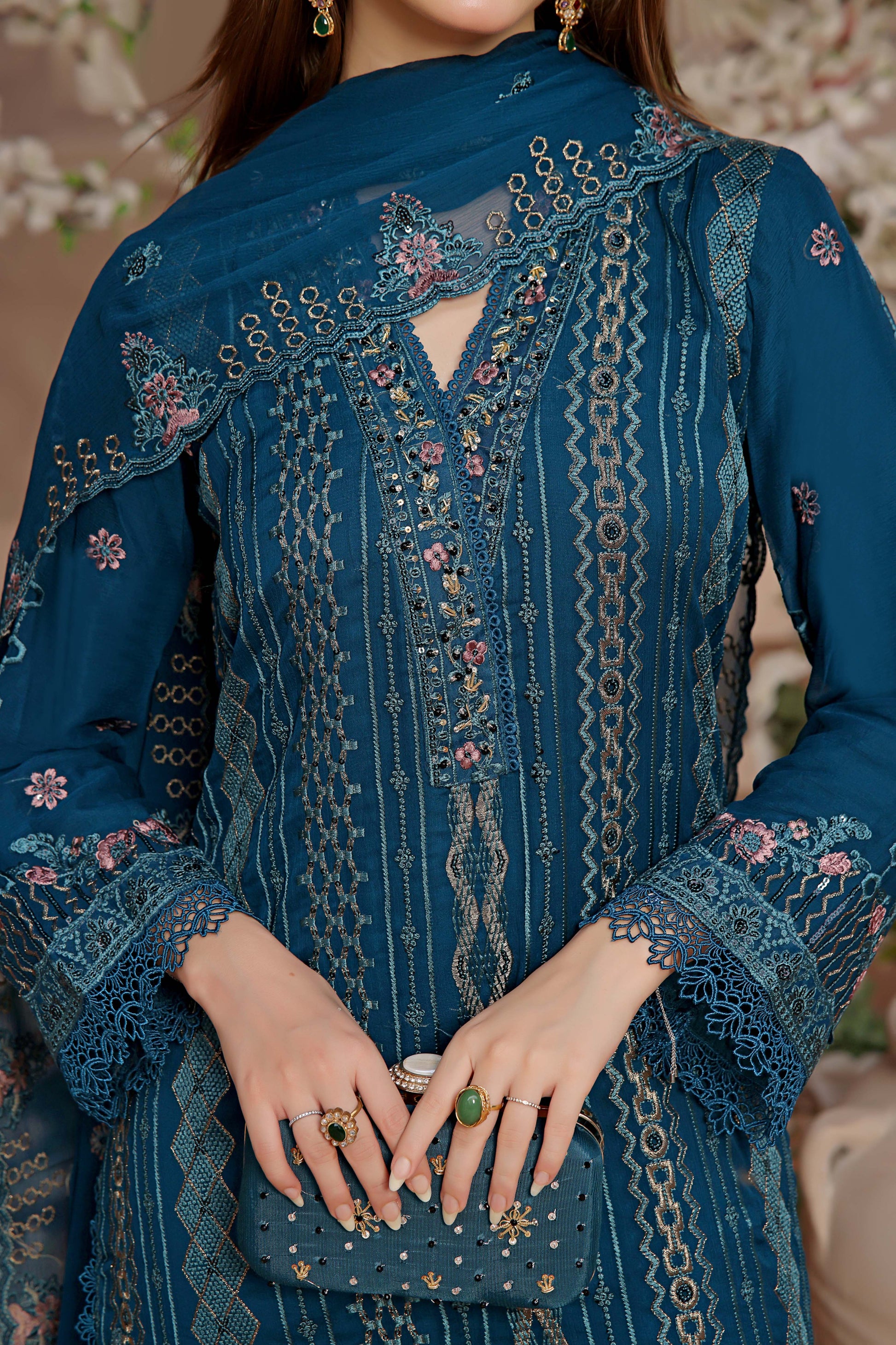 A stunningly embroidered clutch, exquisitely crafted to complement the design of your outfit, adds a touch of elegance.