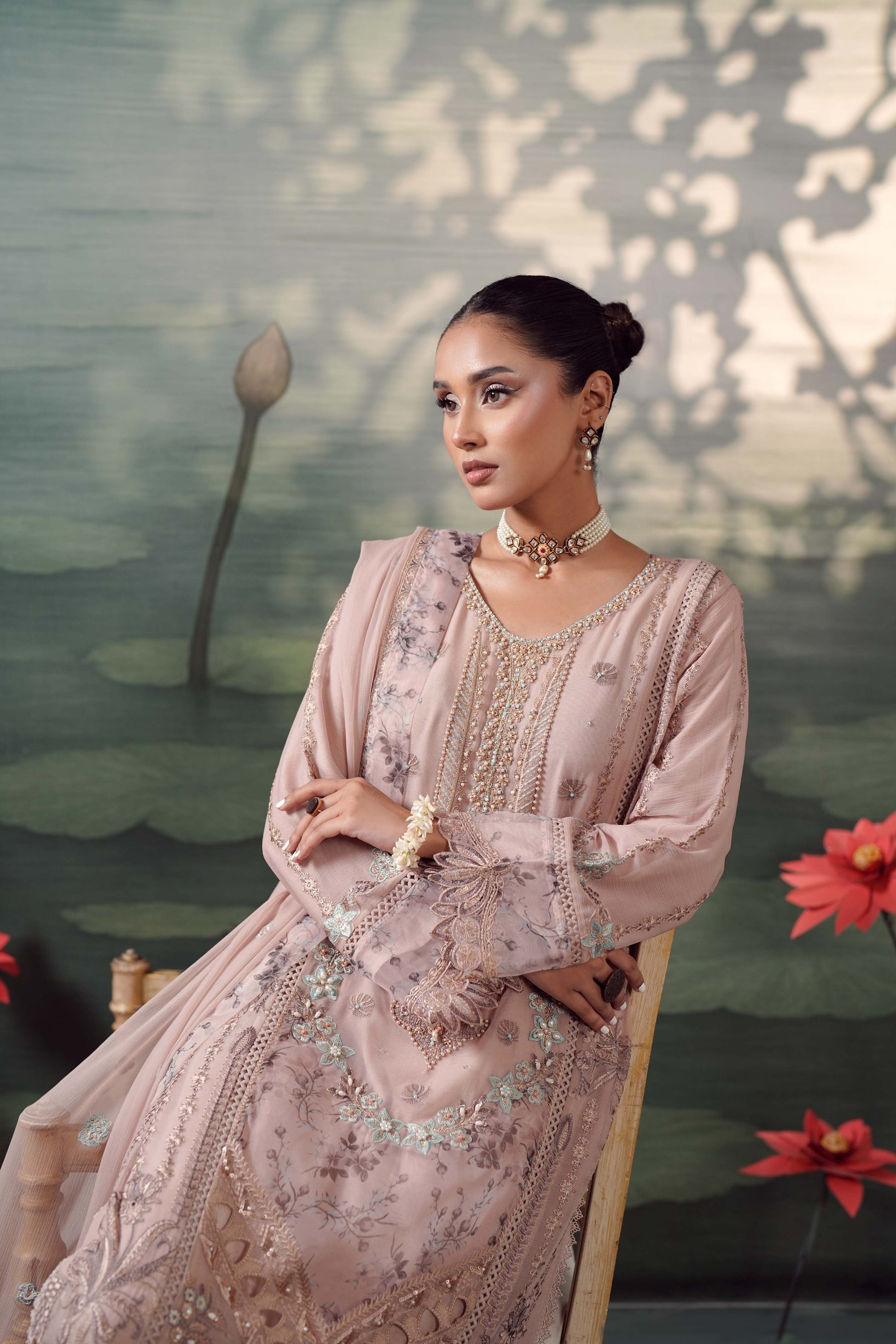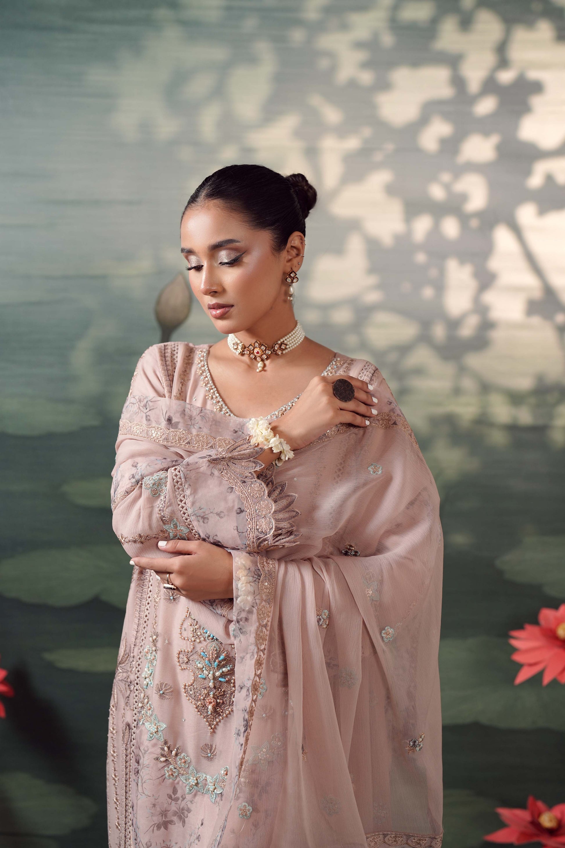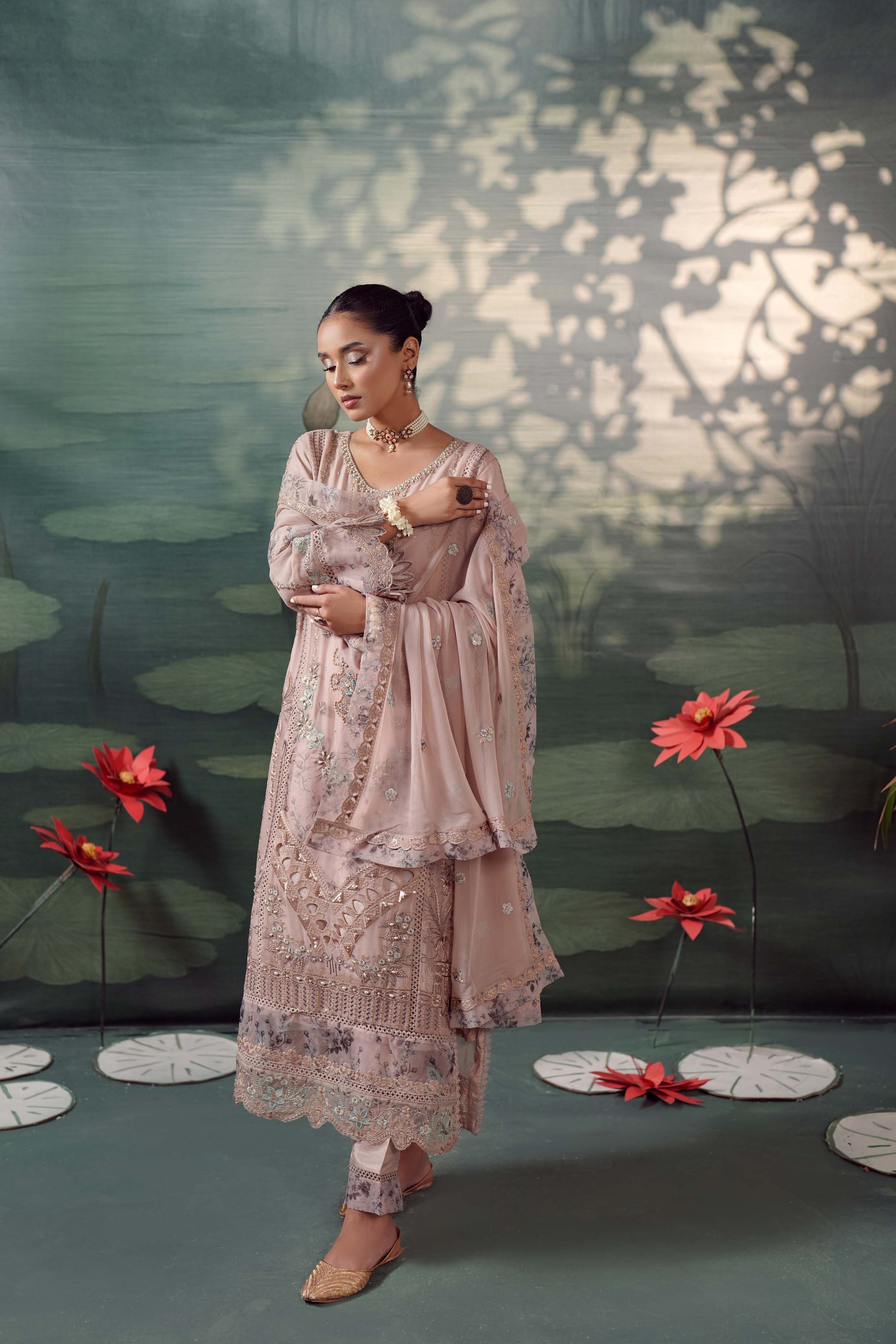Dupatta: The matching chiffon dupatta is gracefully finished with fine embroidery, cutwork, and a striking four-sided printed organza border, adding sophistication to every drape.