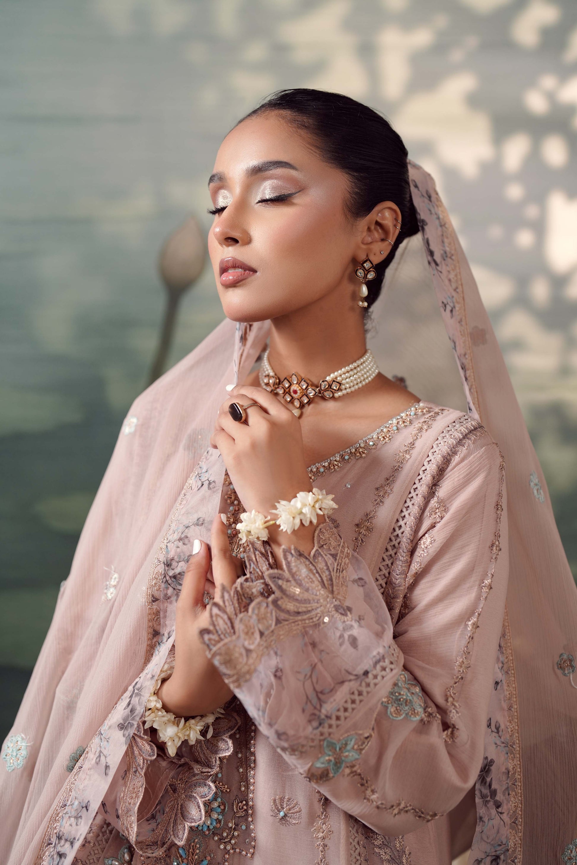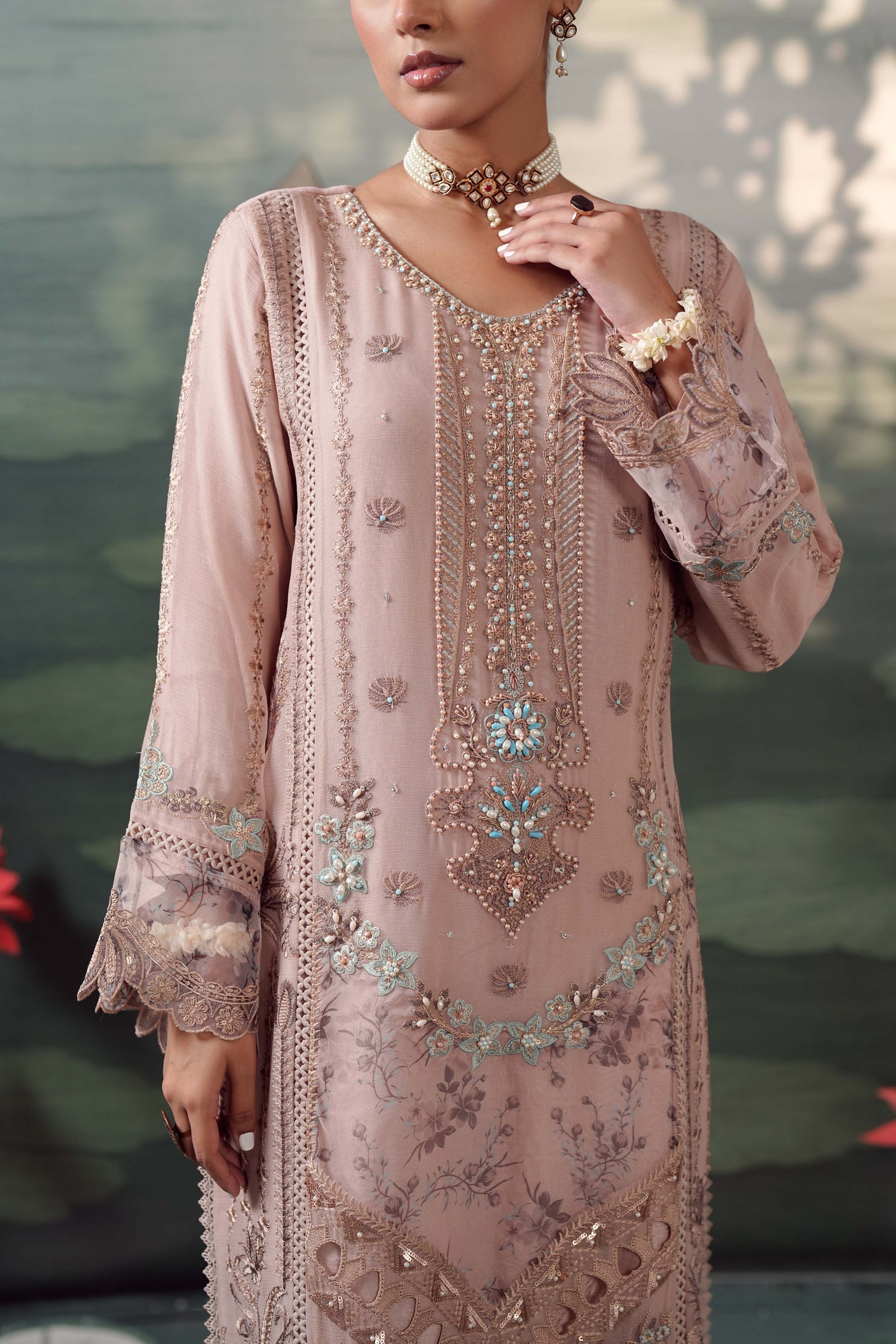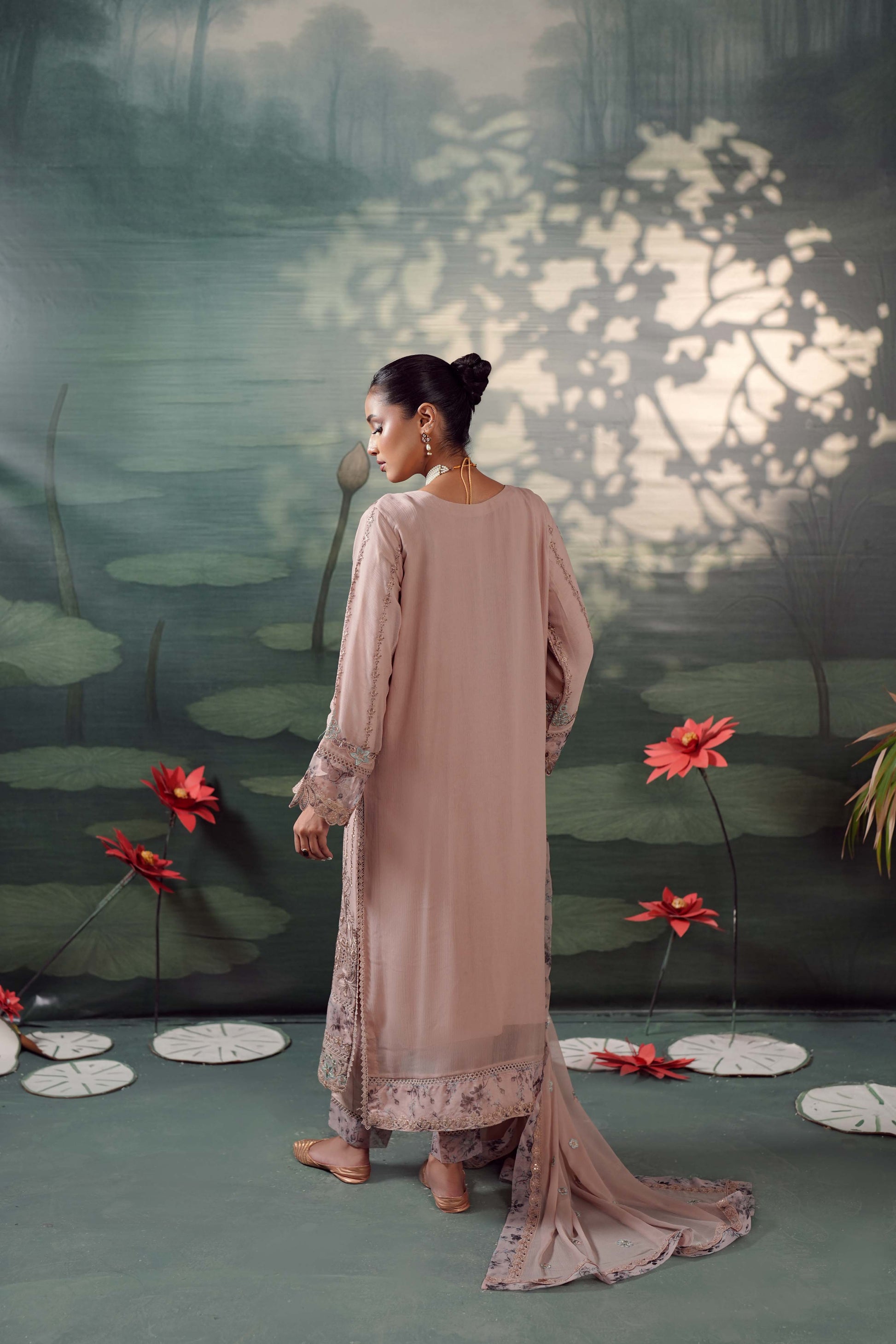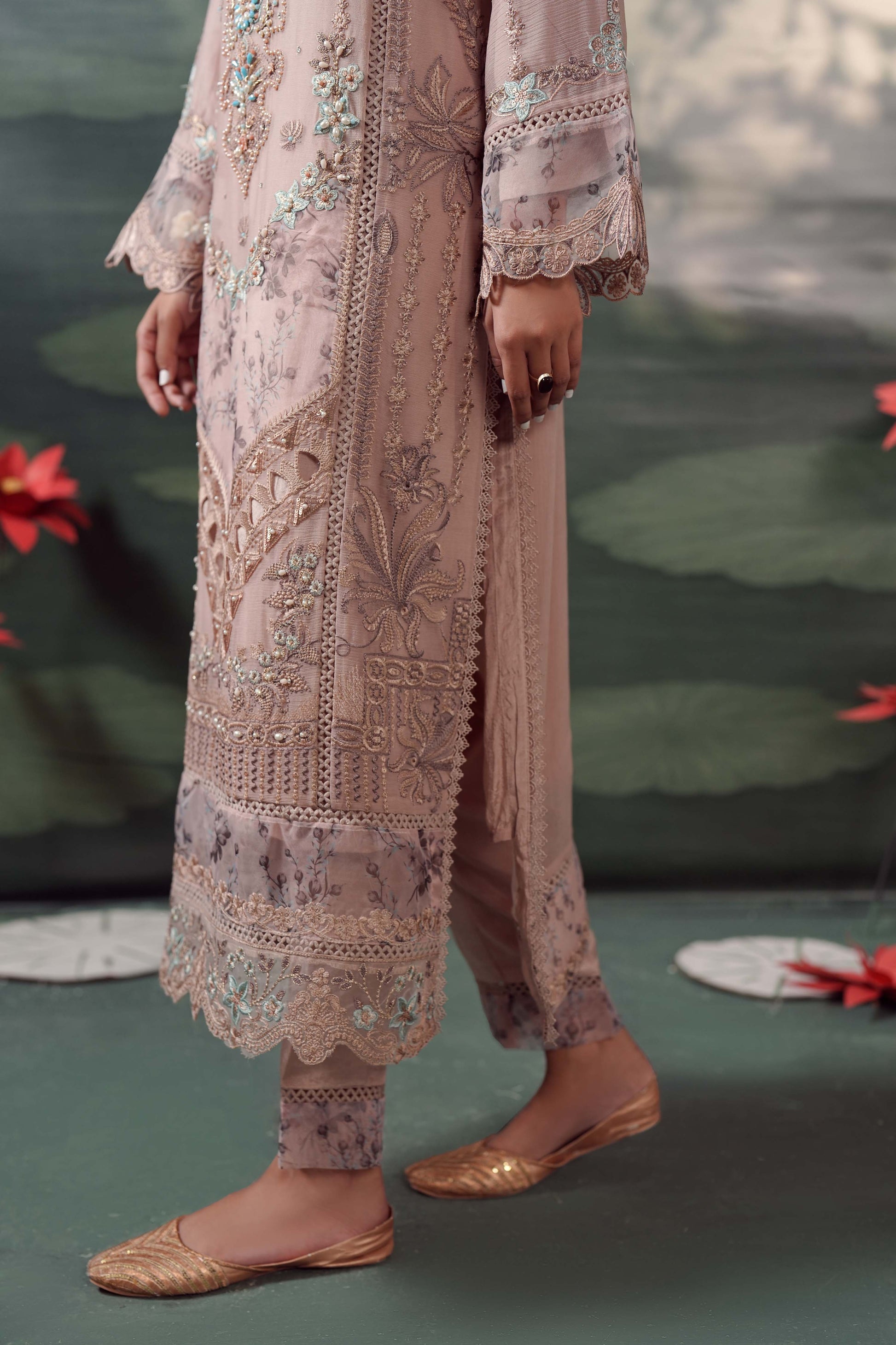 Dupatta: The matching chiffon dupatta is gracefully finished with fine embroidery, cutwork, and a striking four-sided printed organza border, adding sophistication to every drape.