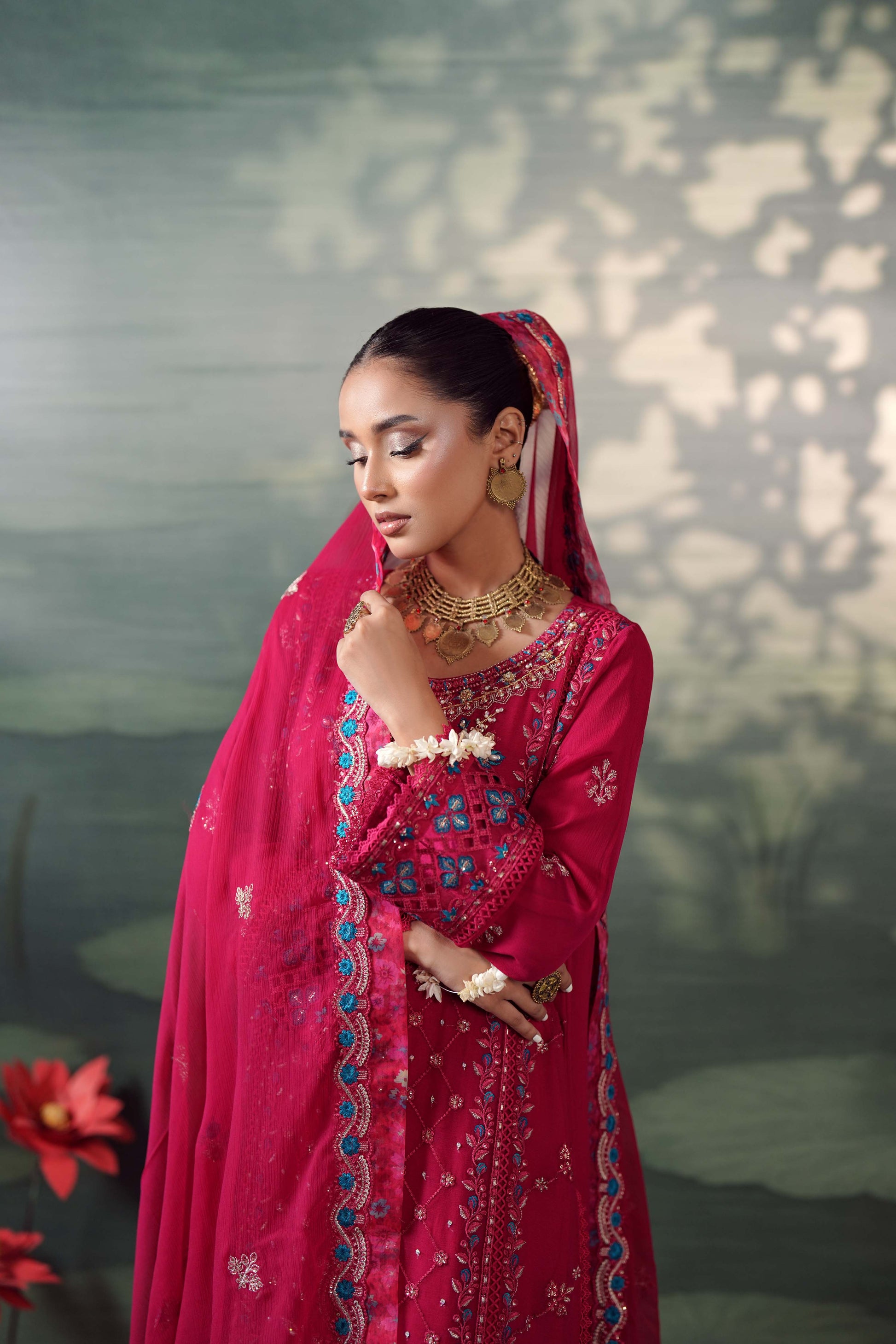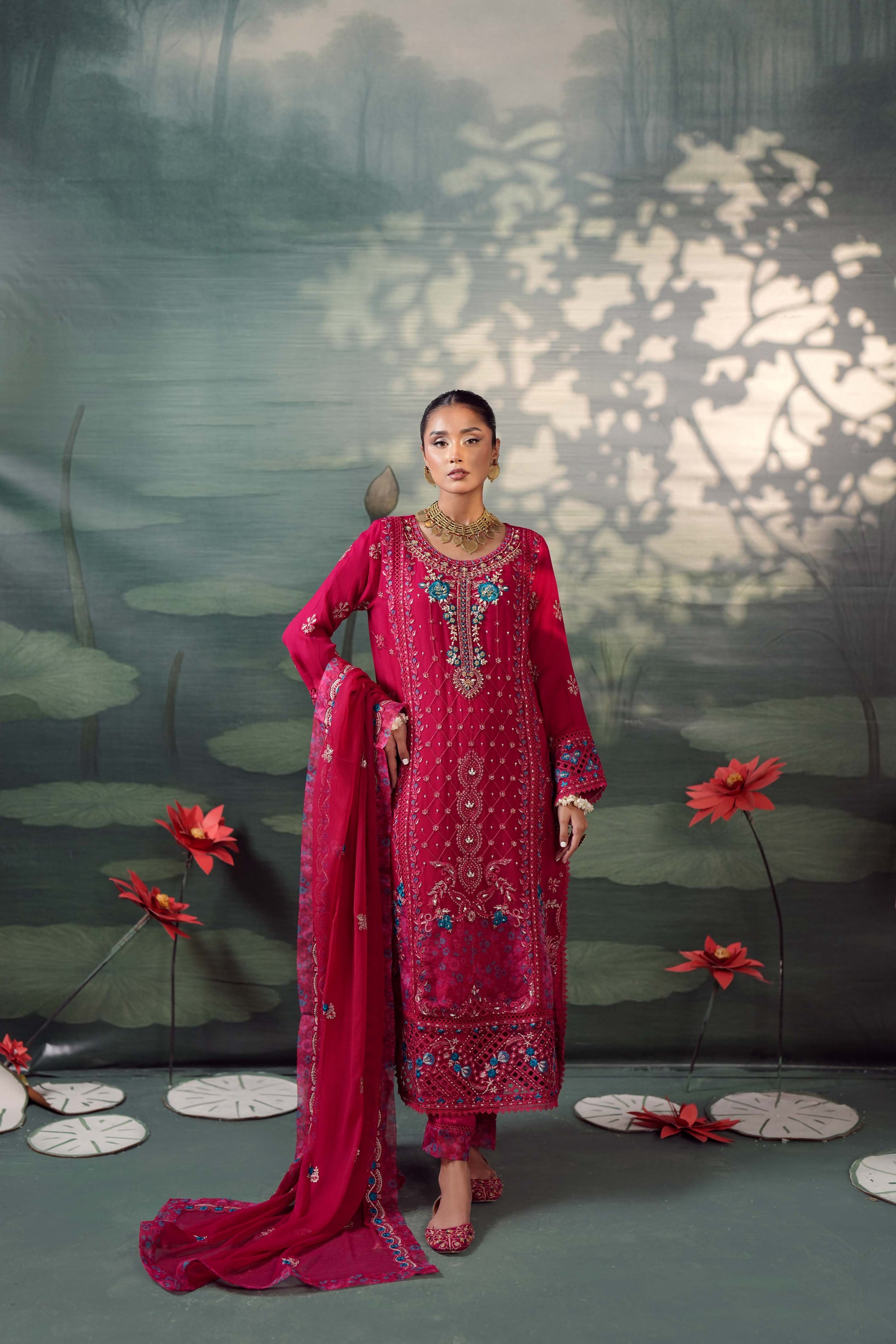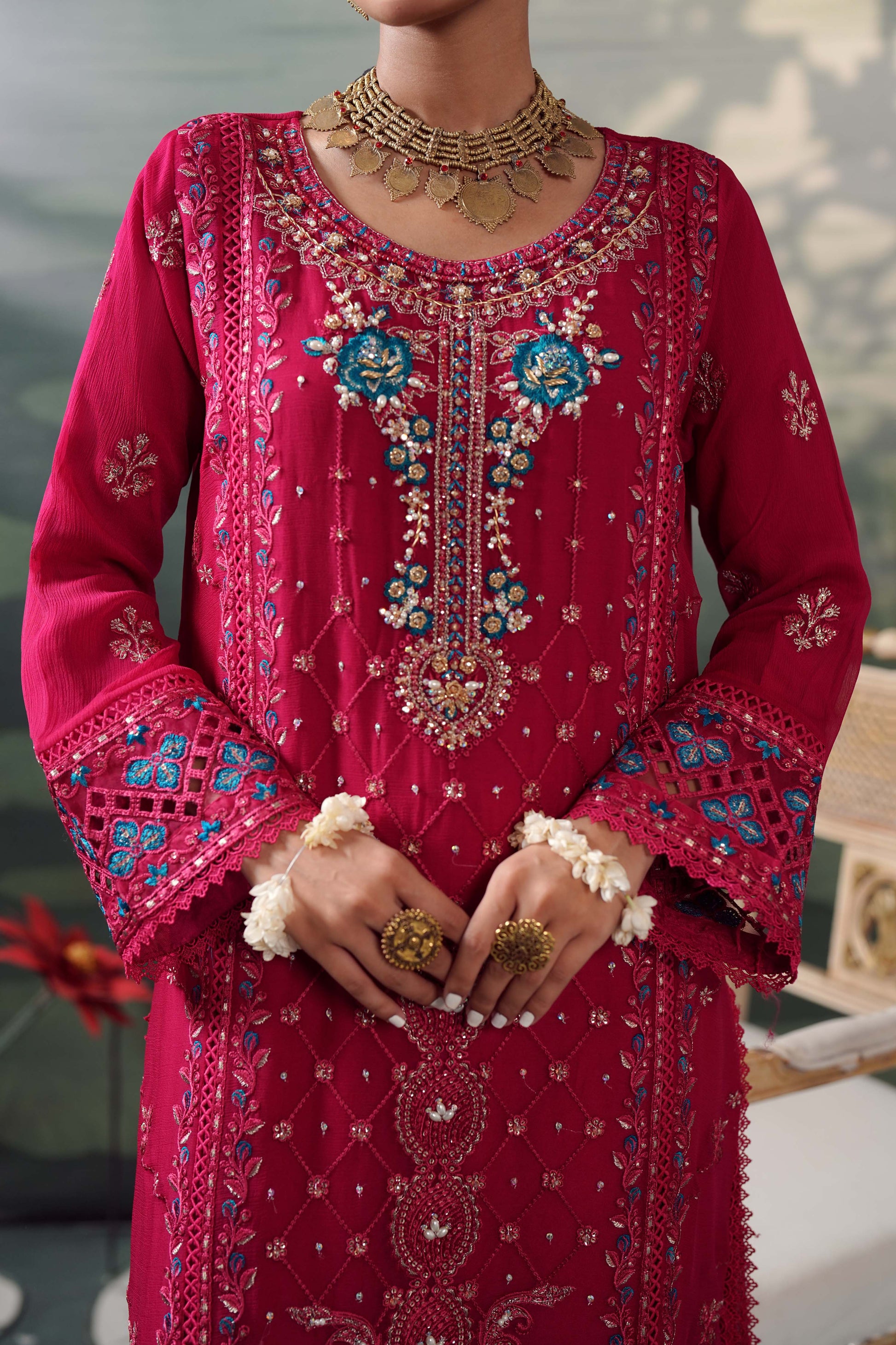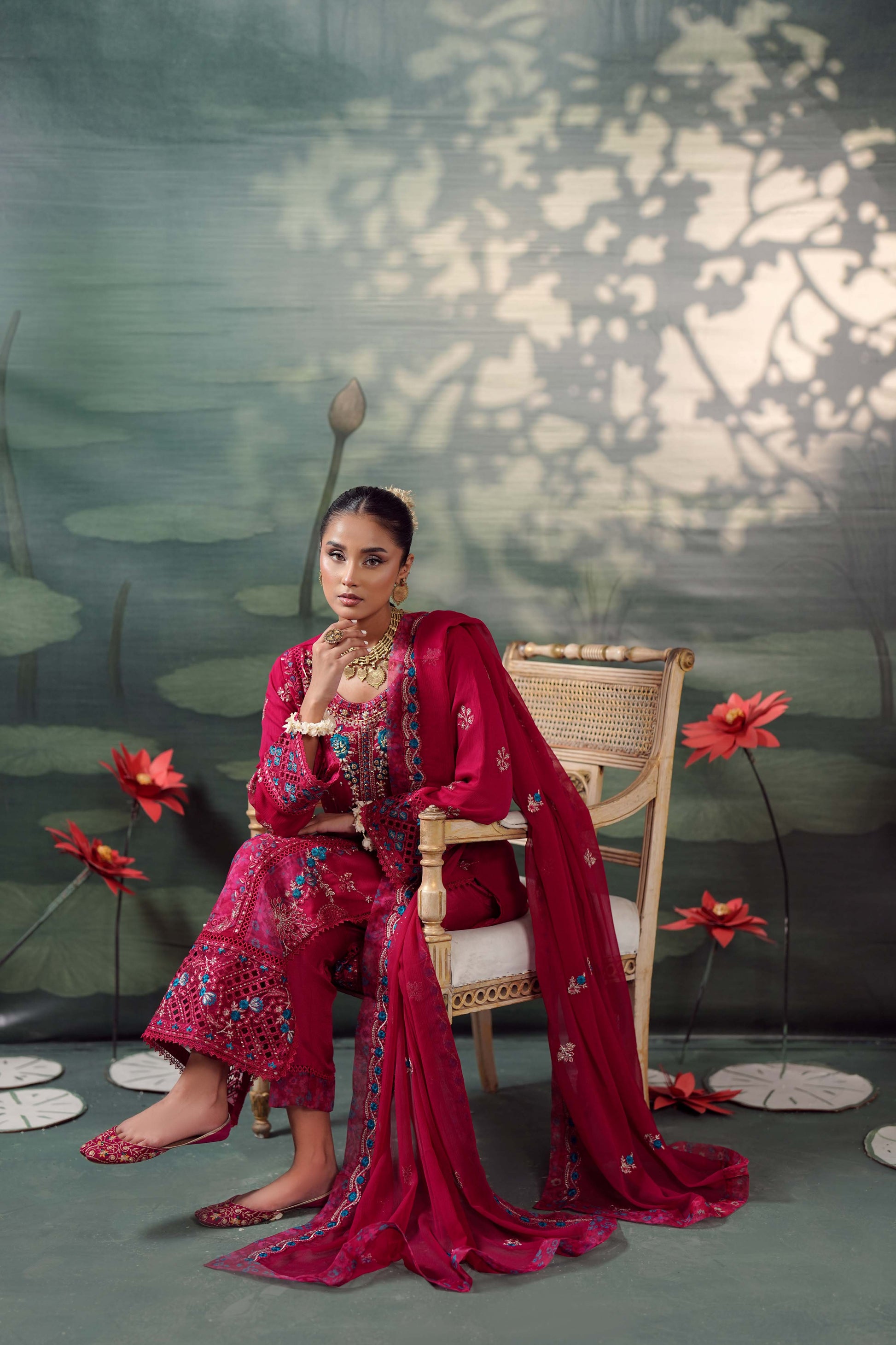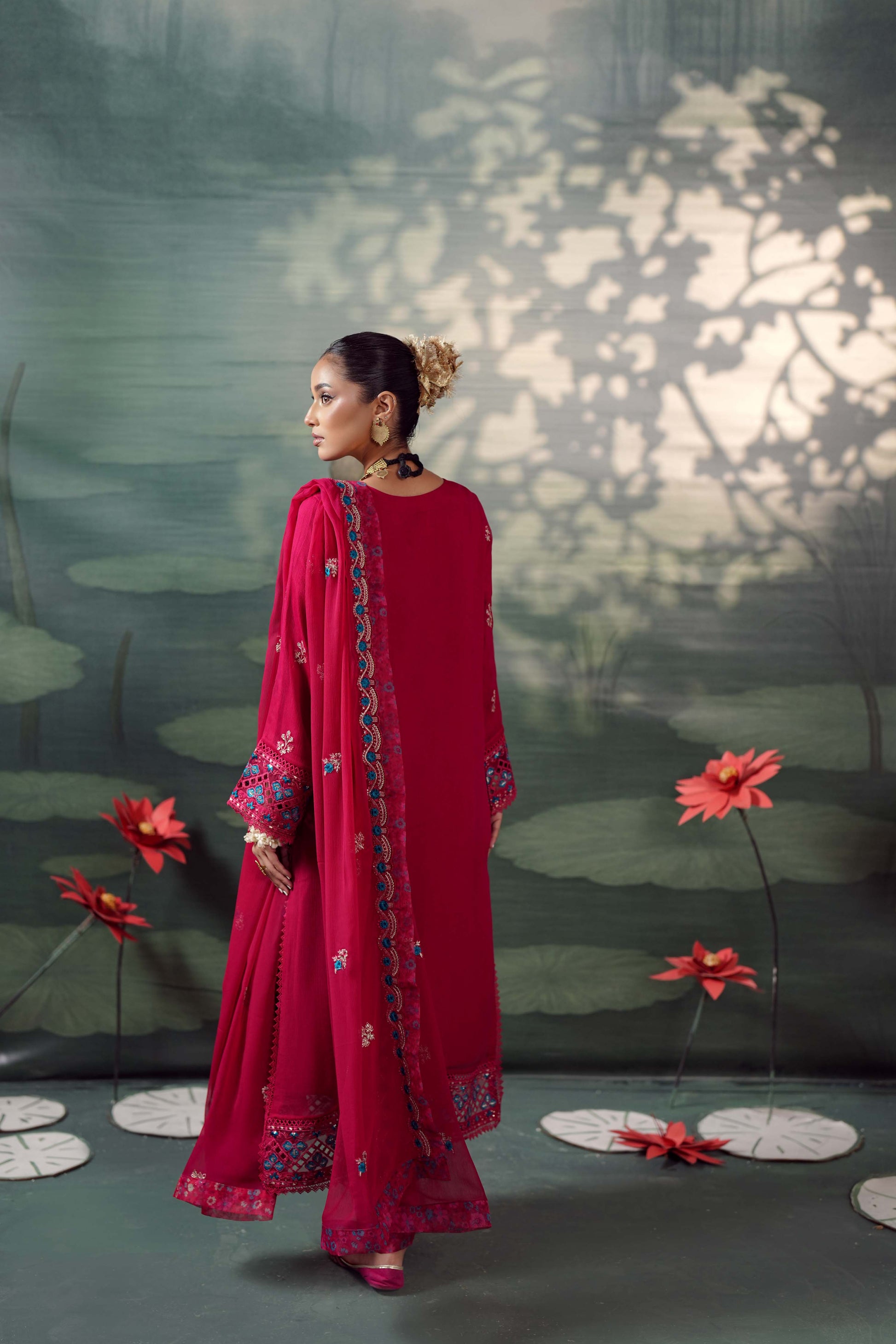 Dupatta: The matching chiffon dupatta is gracefully finished with fine embroidery, cutwork, and a striking four-sided printed organza border, adding sophistication to every drape.