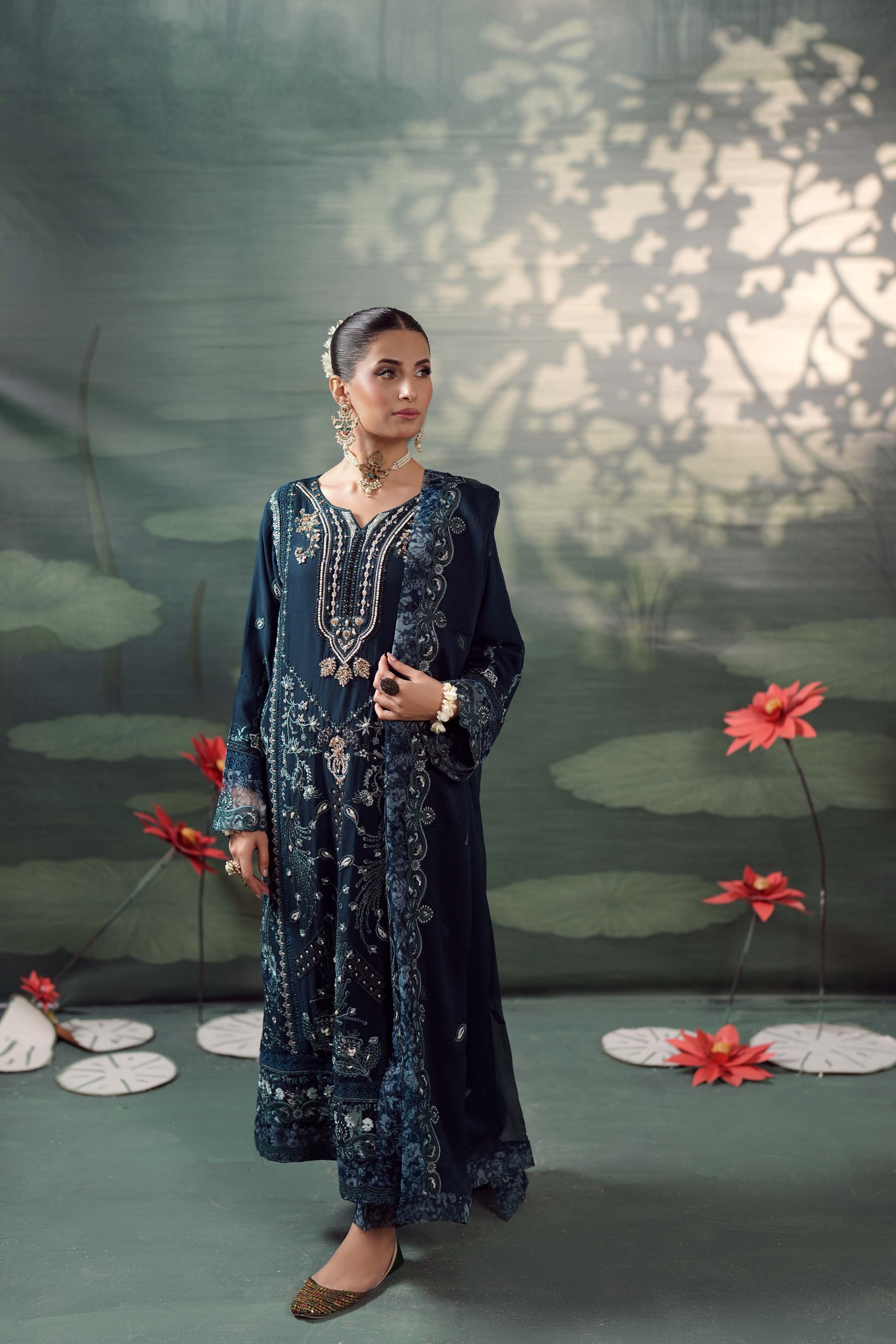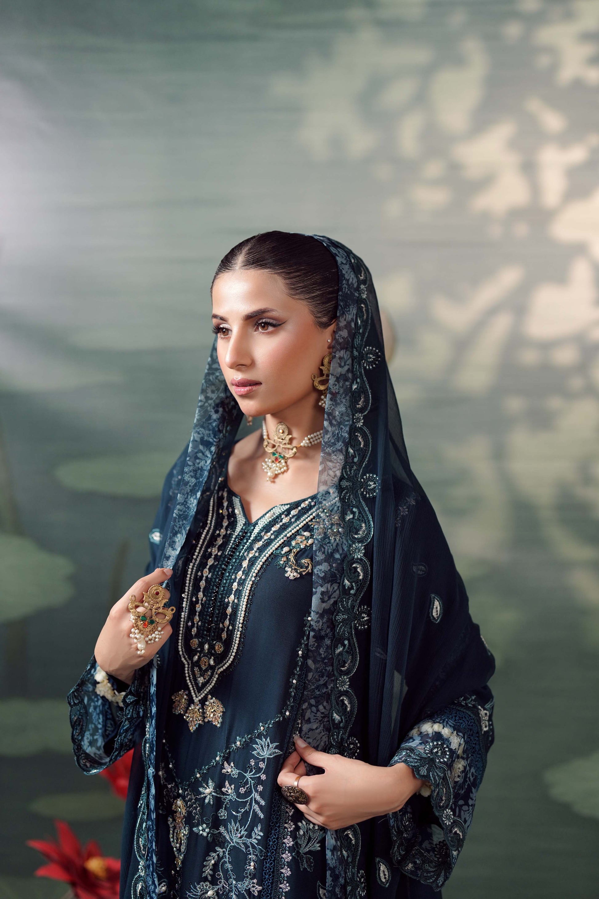 Dupatta: The matching chiffon dupatta is gracefully finished with fine embroidery, cutwork, and a striking four-sided printed organza border, adding sophistication to every drape.