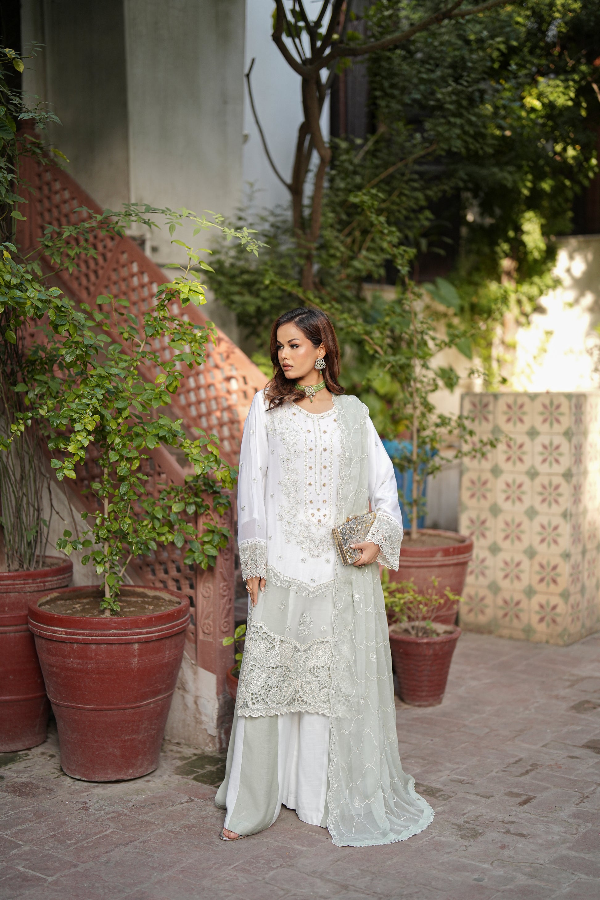 A beautifully embroidered chiffon dupatta adds an air of sophistication and completes the outfit with timeless charm.