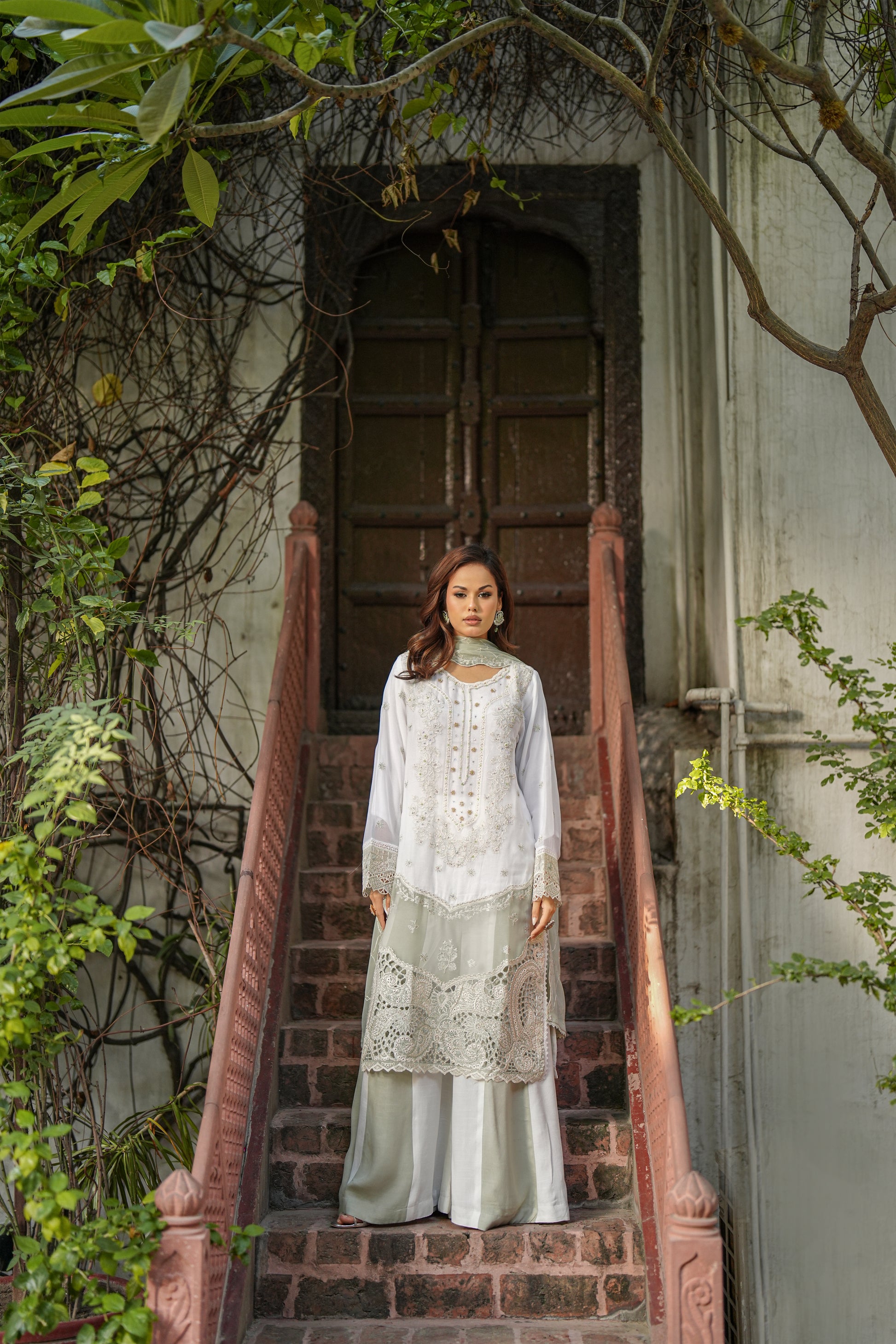 Subtle elegance defines Sajni — a collection crafted to celebrate refined beauty and graceful design. This 3-piece chiffon ensemble brings together soft hues, intricate embroidery, and delicate lacework for a look that’s eternally sophisticated.